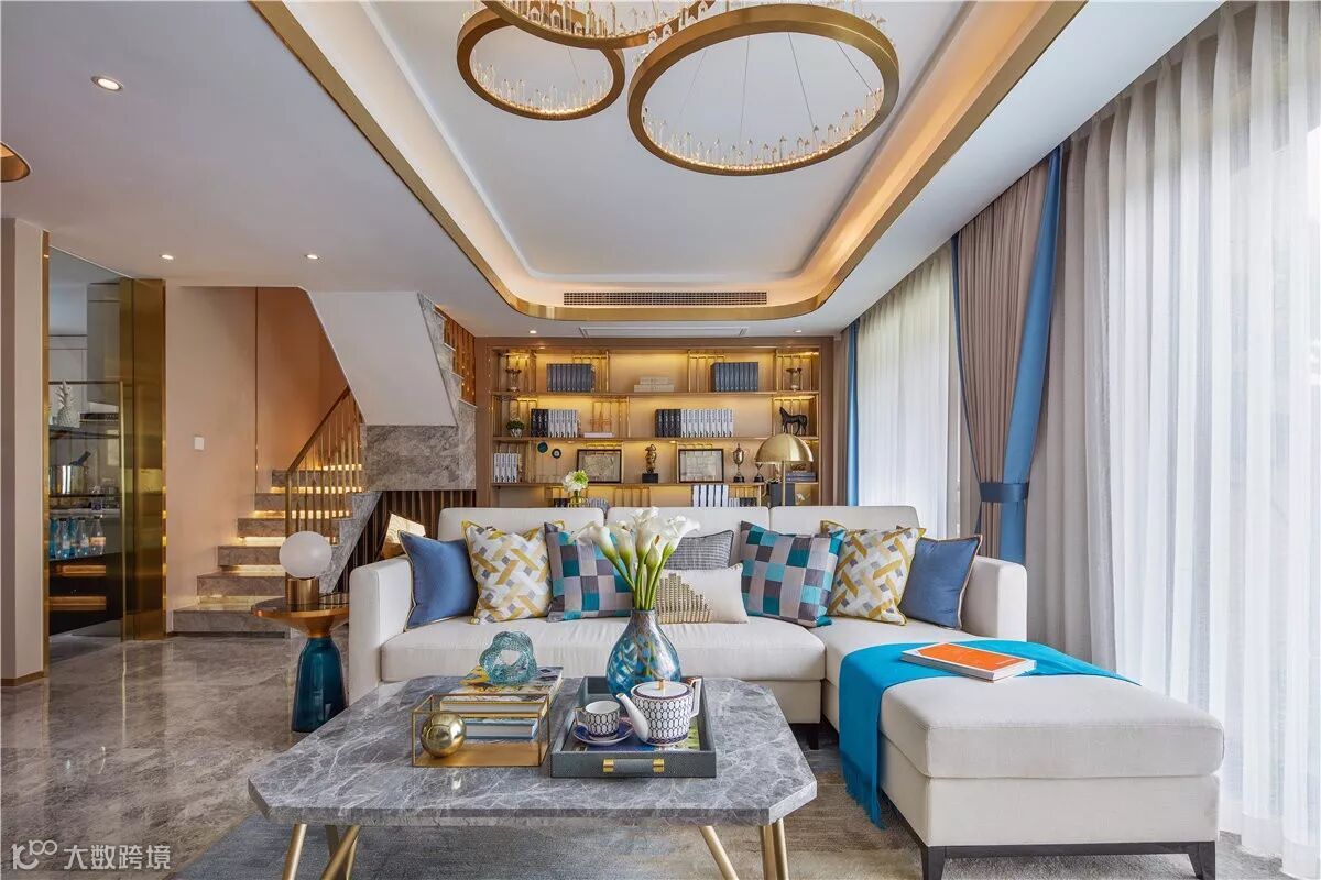 整个空间的设计手法比较现代,但又加入了一些返古、中式的元素,在家具布艺纹理、质感等细节处体现,同时还加入金色元素,区别于过去的低奢设计,展现出恰到好处的张扬感。