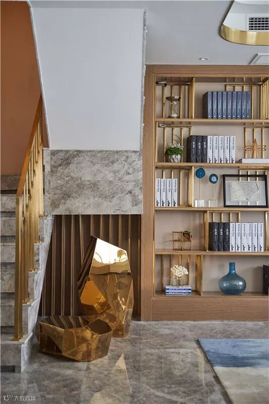 楼梯底角也不被忽视,特意选取一组当代金属雕塑作品来装点,即使是不经意的一瞥也将视线聚焦在美的事物上。