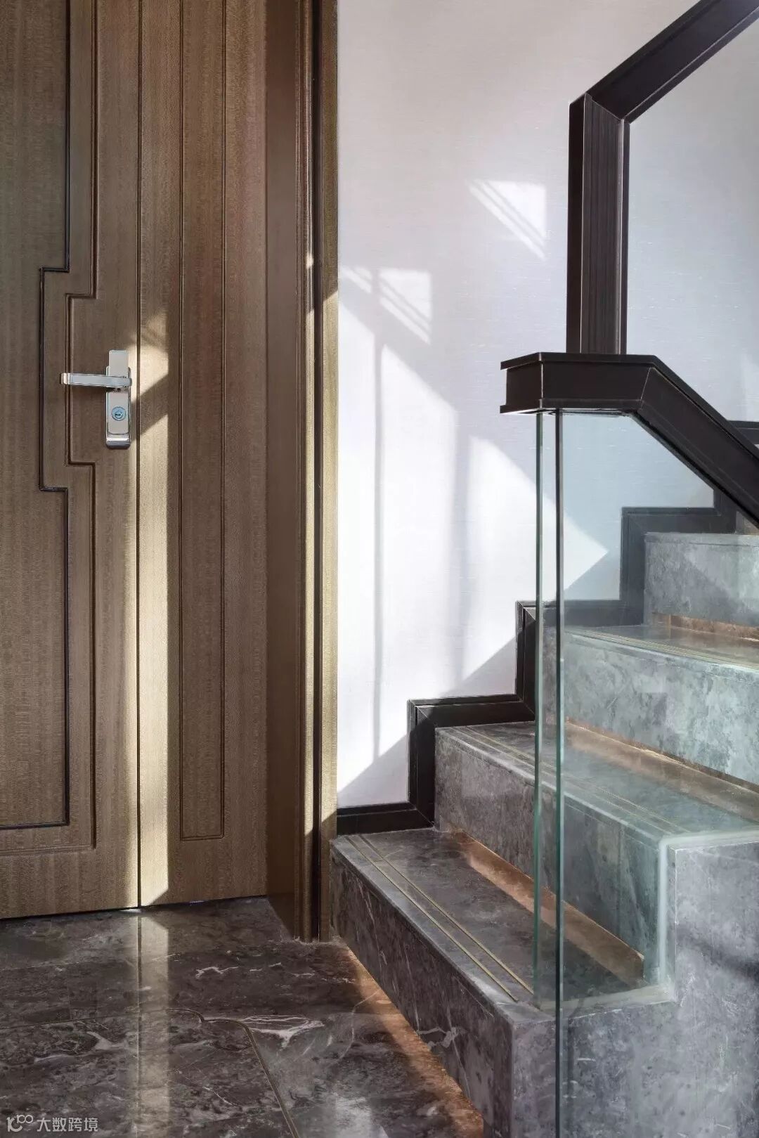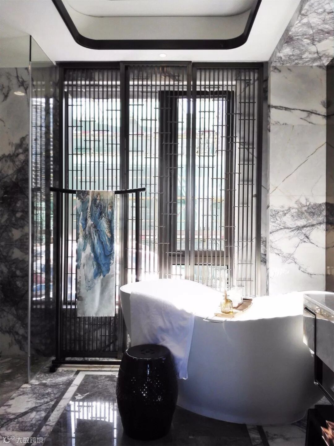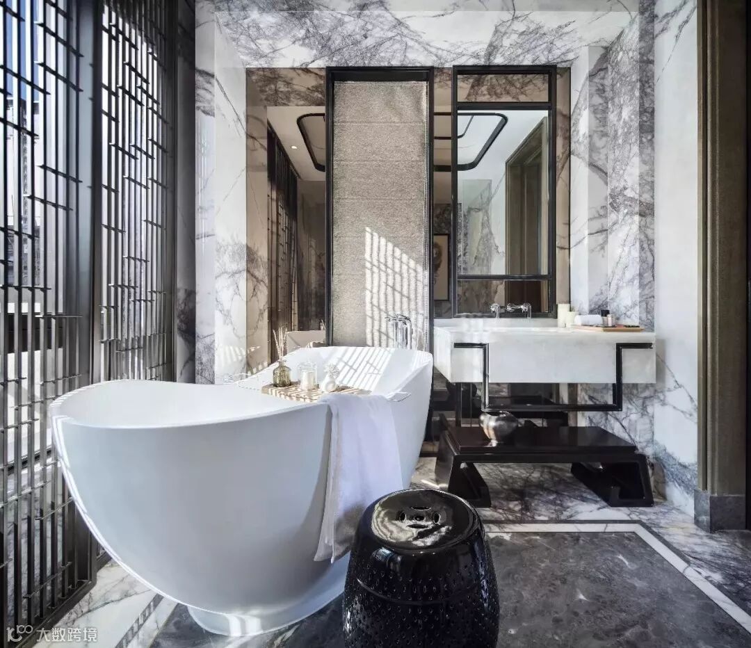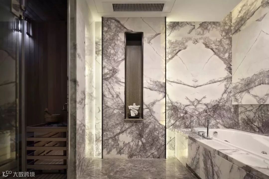 主卫以自然、质感呈现为主要法则,墙身采用冰玉石材,纹理如水墨般自然延展,日光透过竖向格栅,营造出无限的意境氛围感。