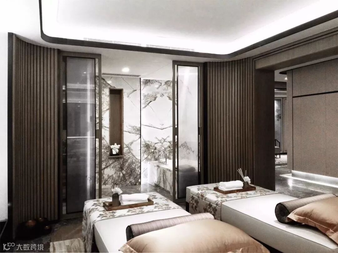 SPA养生区域融按摩、干蒸、湿蒸、泡池功能一体,采用木格栅墙面围合空间,与竹景相融,结合夹绢山水画,为女主人营造宁静舒雅,禅意悠长的空间意蕴。在插花区的空间里,设计师利用建筑天井为空间创造的通透气质,墙面采用海棠花叠级,与庭院氛围自然融合。
