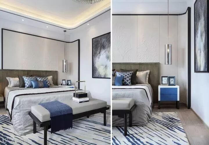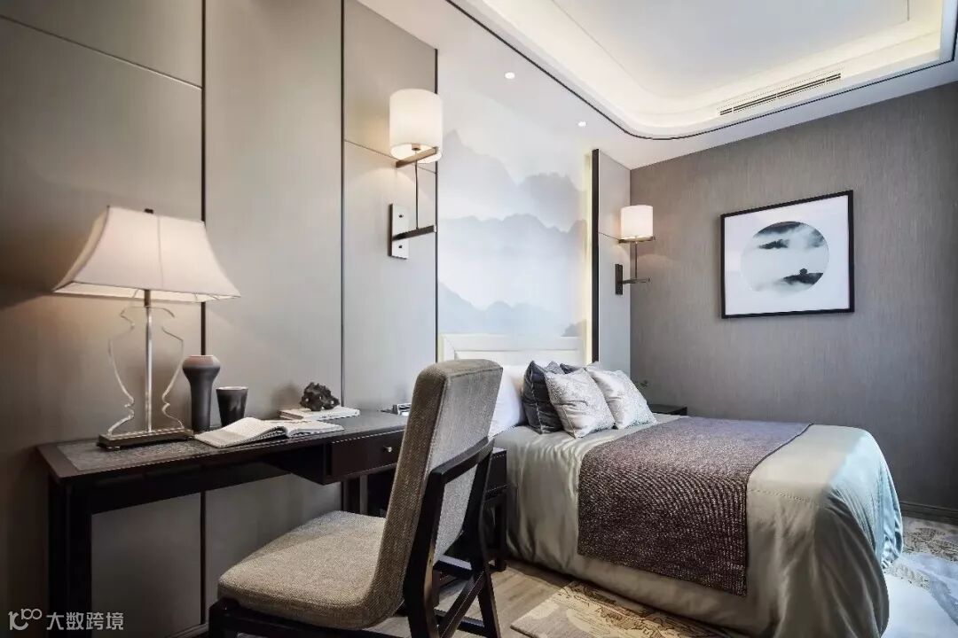 古韵新意,美境相连。主卧结合墙身硬包、天花嵌入的古铜不锈钢、艺术玻璃、皮雕和布艺,绝佳视觉美的背后其实是对设计师和施工团队的严苛高要求。