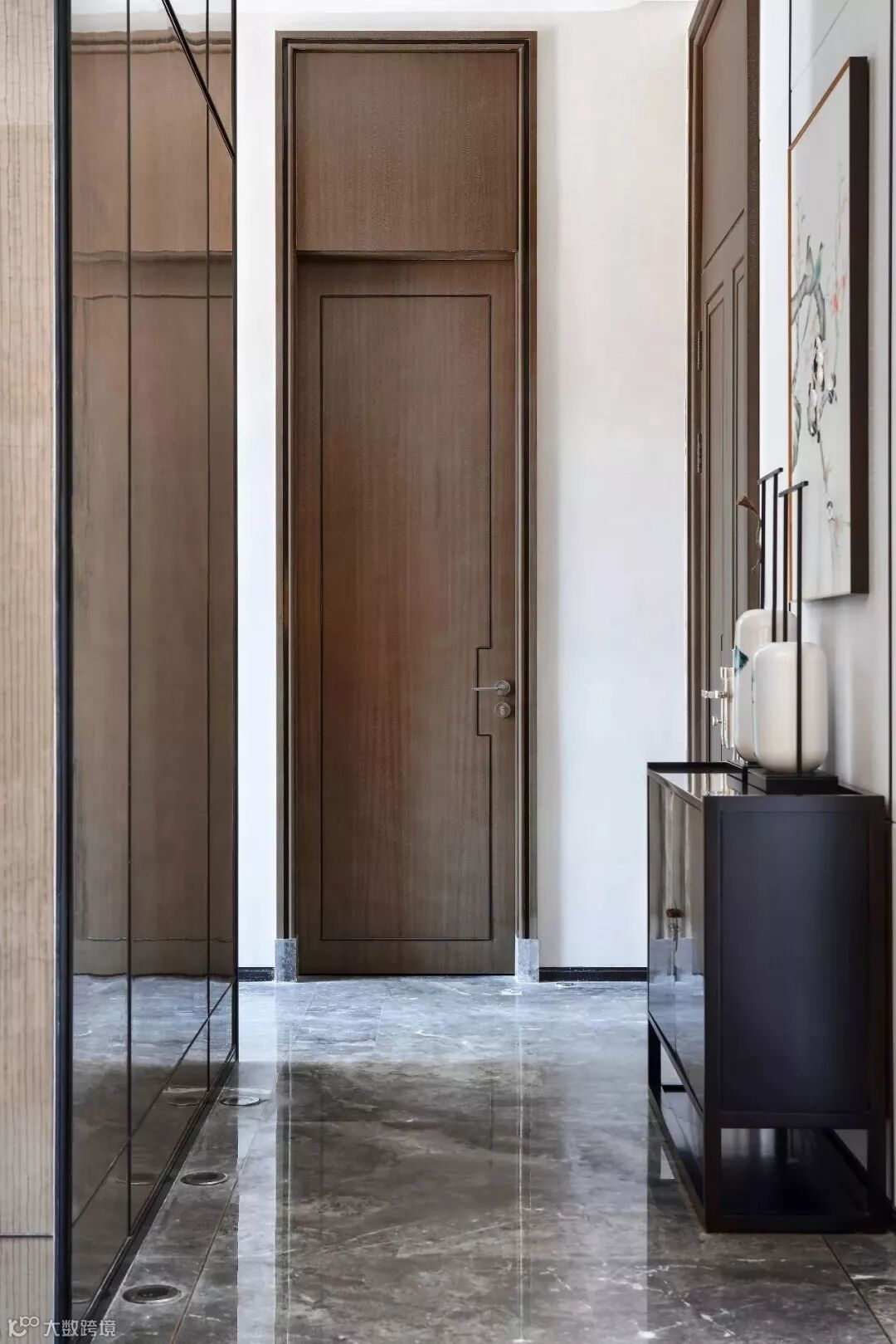 品酒区走廊采用现代屏风的形体在墙体大面积铺展,提取山水元素,通过空间的营造,体现主人典雅质朴、大方端庄的审美趣味。