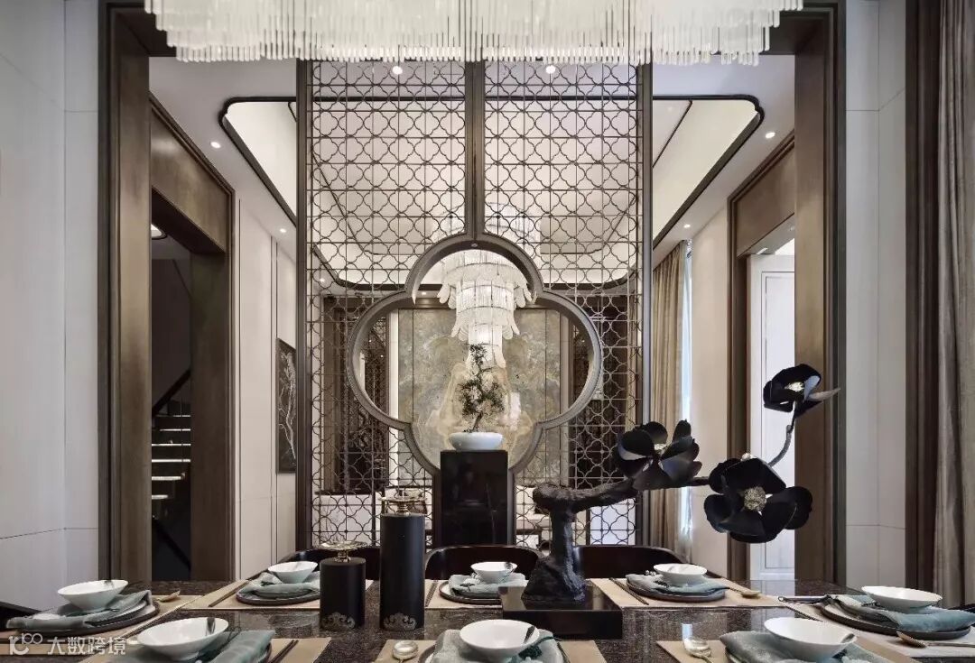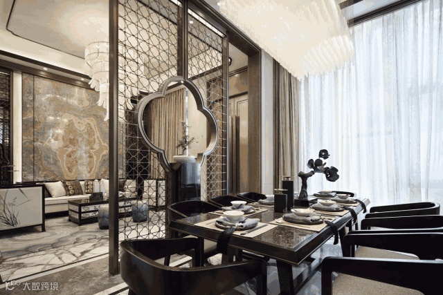 客厅空间运用海棠花造景屏风一分为二,营造隔而不断的空间效果。从天花吊顶到墙面,柔顺流畅的线条变化使得空间干净利落。独特纹理的玉石,为客厅增添了不少柔美优雅。中式屏风的雅致,配合软硬结合的金属感线条,极富质感的餐椅和特色纹案的地板,让整个餐厅仪式感中不乏轻松和舒适。