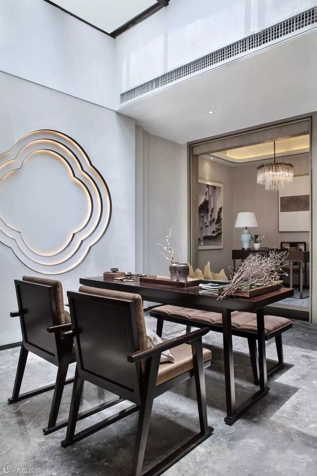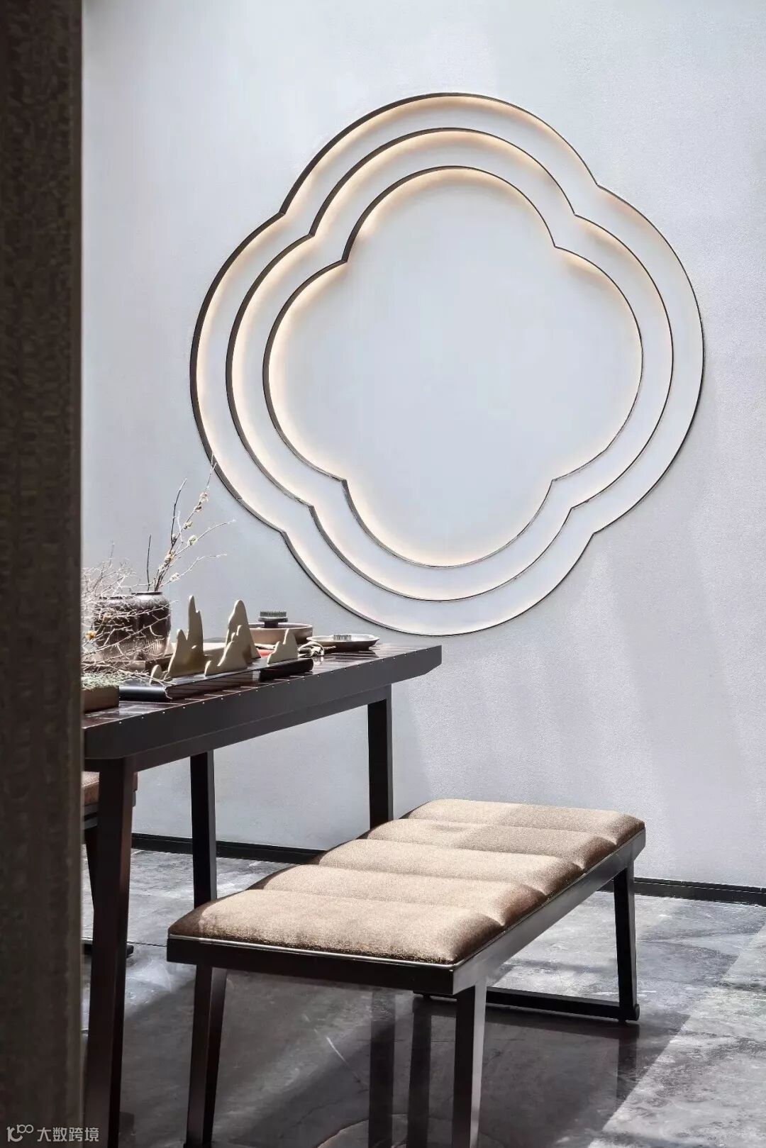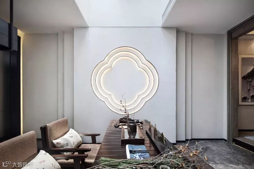 在插花区的空间里,设计师利用建筑天井为空间创造的通透气质,墙面采用海棠花叠级,与庭院氛围自然融合。