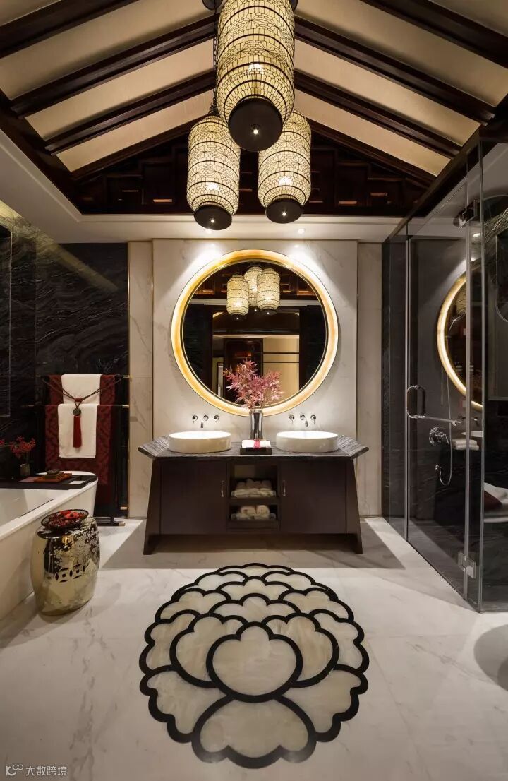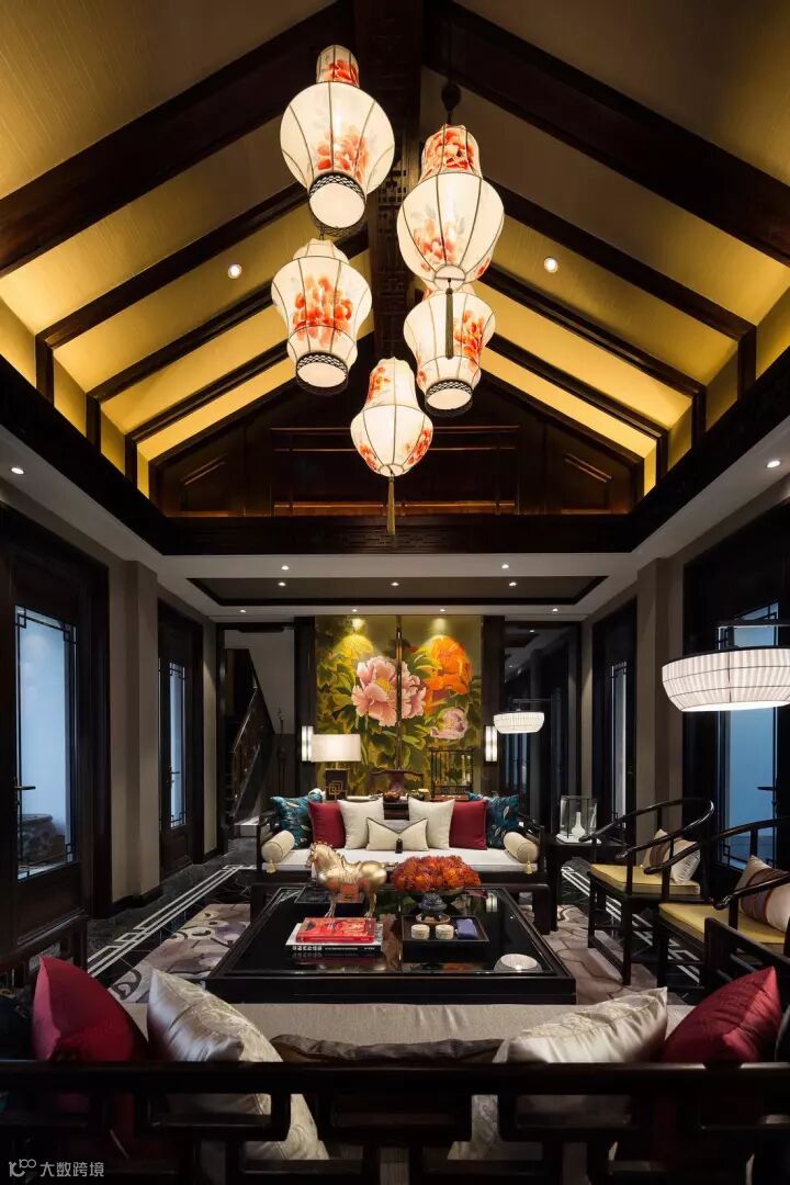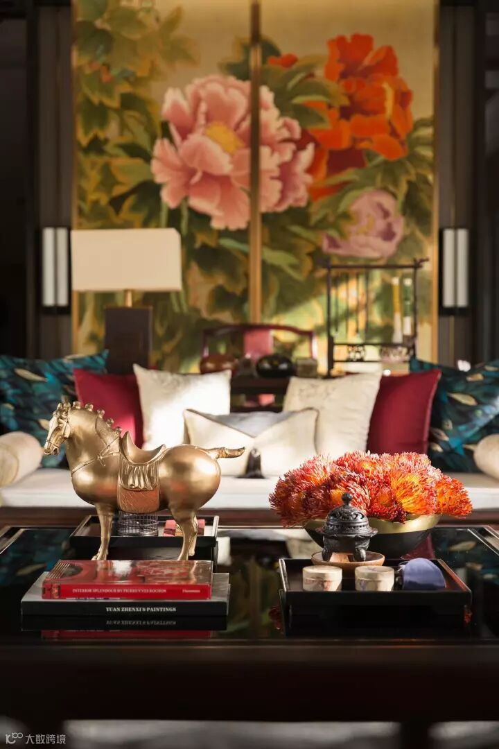 植入传统中式空间“木”,搭配极富手感的丝绸织物与真皮布艺,并缀以“牡丹花图案”于趟门、地毡、抱枕、夹绢玻璃中。
