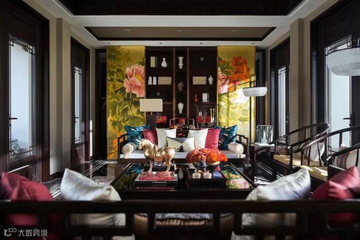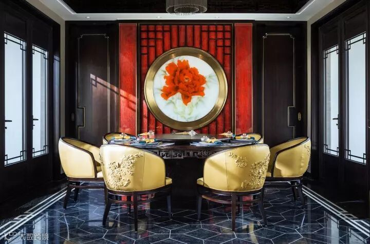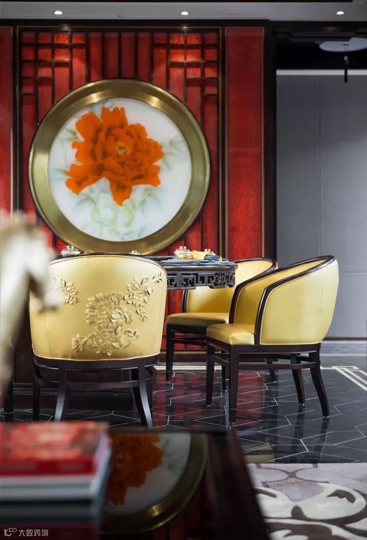 以“花中之王”牡丹为主题线索,将其以夹绢玻璃、吊灯、趟门等多种不同的“形”与空间融为一体,缀以“中国红”、古典黑等经典、热烈的中式色彩搭配,演绎清雅风韵。