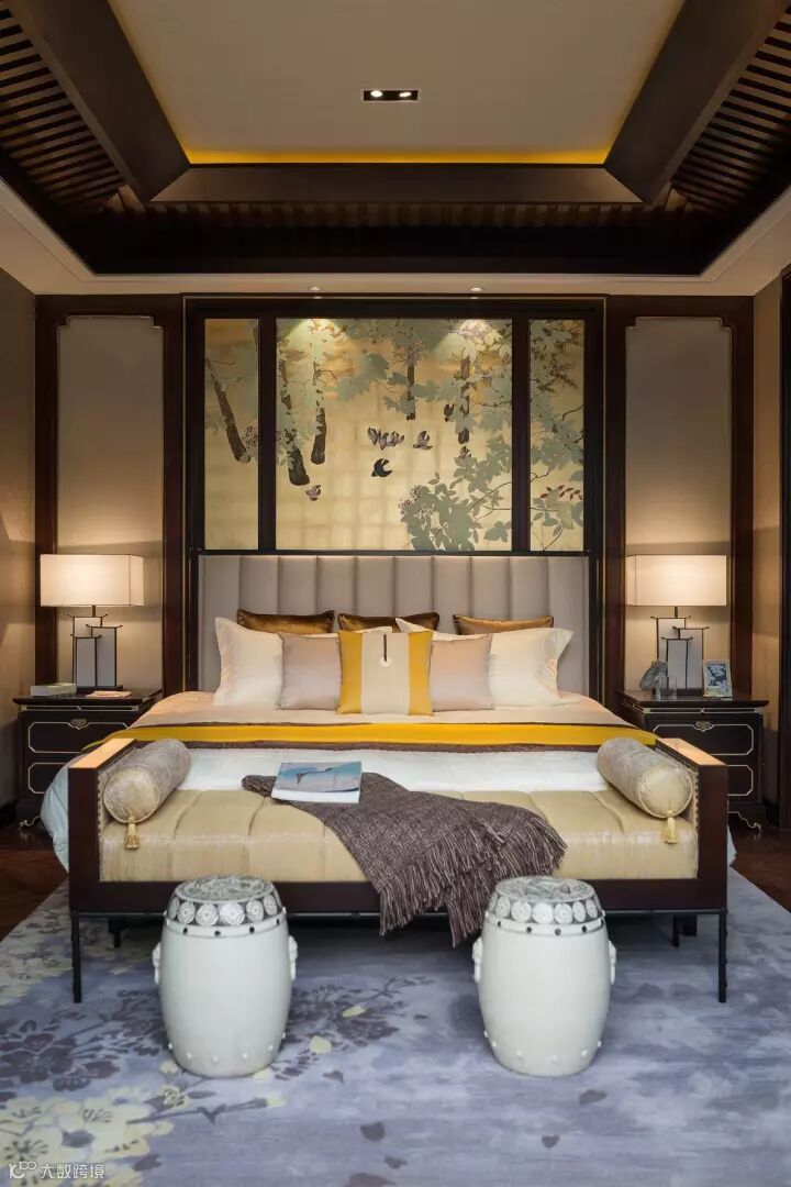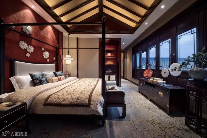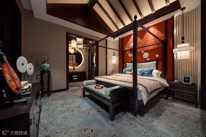 床头的手绘墙纸再次唱响“牡丹”主题,在中式吊灯的映衬下,盛开得格外艳丽。