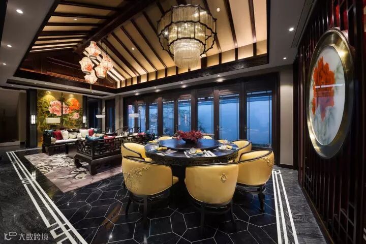 现代设计的牡丹花吊灯与背景的牡丹夹绢交相辉映,色彩与厨房的隔断木格屏风形成巧妙联结。