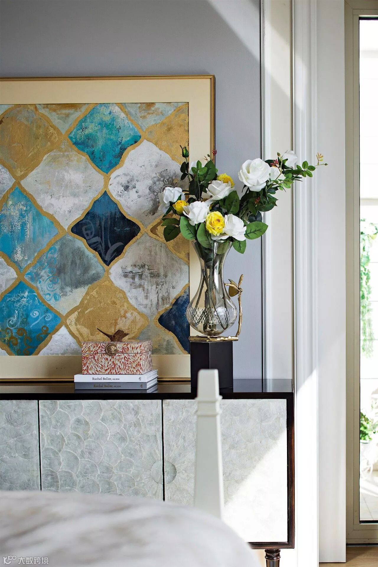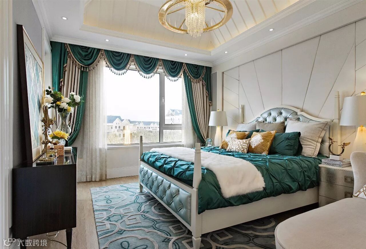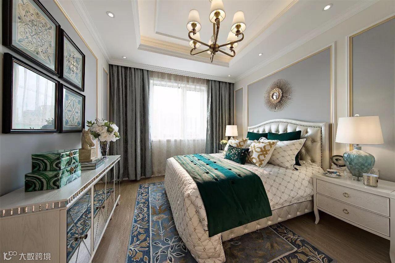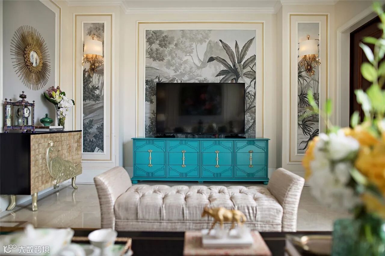 贝壳面的装饰边柜体现出主人的尊贵与品位,在草木绿色主色调的衬托下,花鸟元素在整个空间更是显得活灵活现。