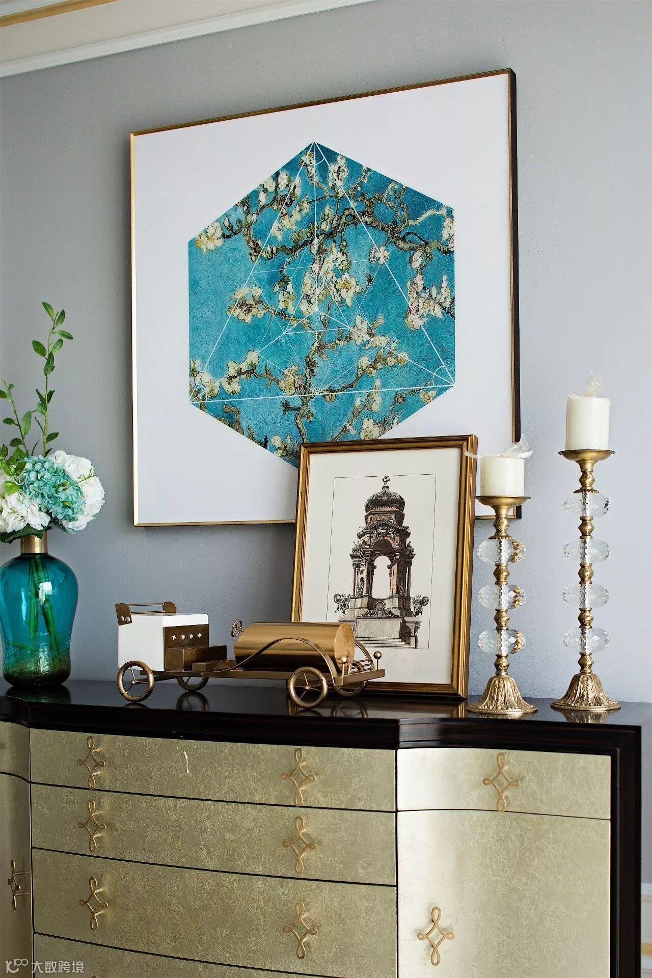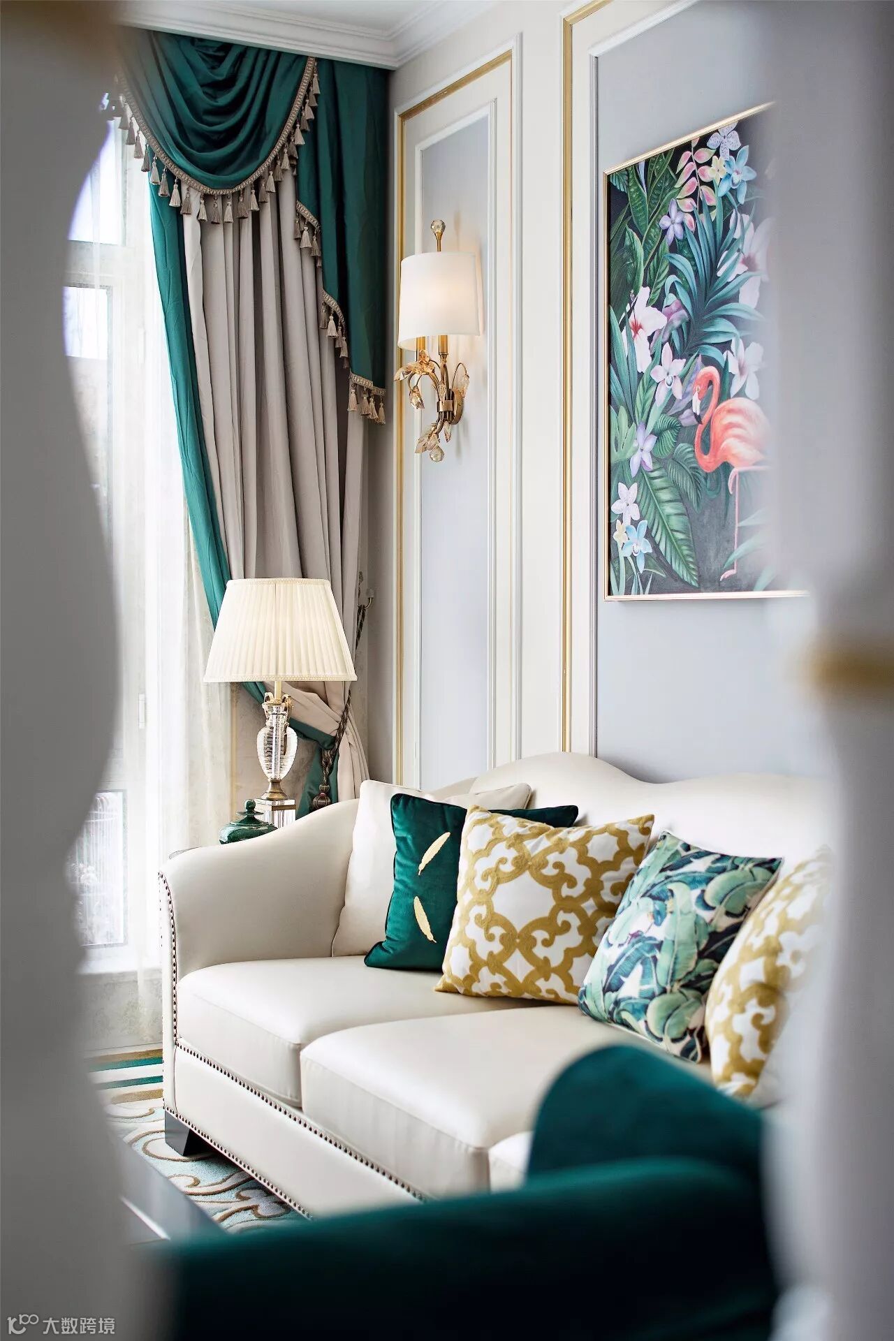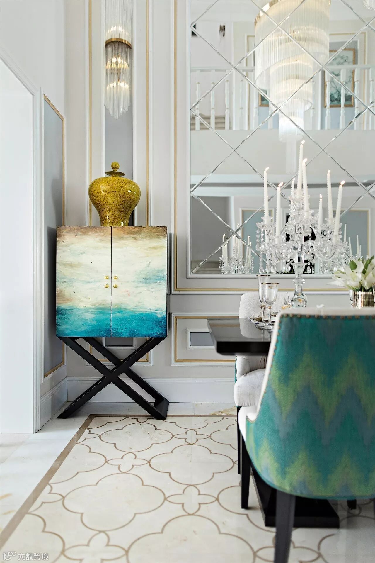 贝壳面的装饰边柜体现出主人的尊贵与品位,在草木绿色主色调的衬托下,花鸟元素在整个空间更是显得活灵活现。