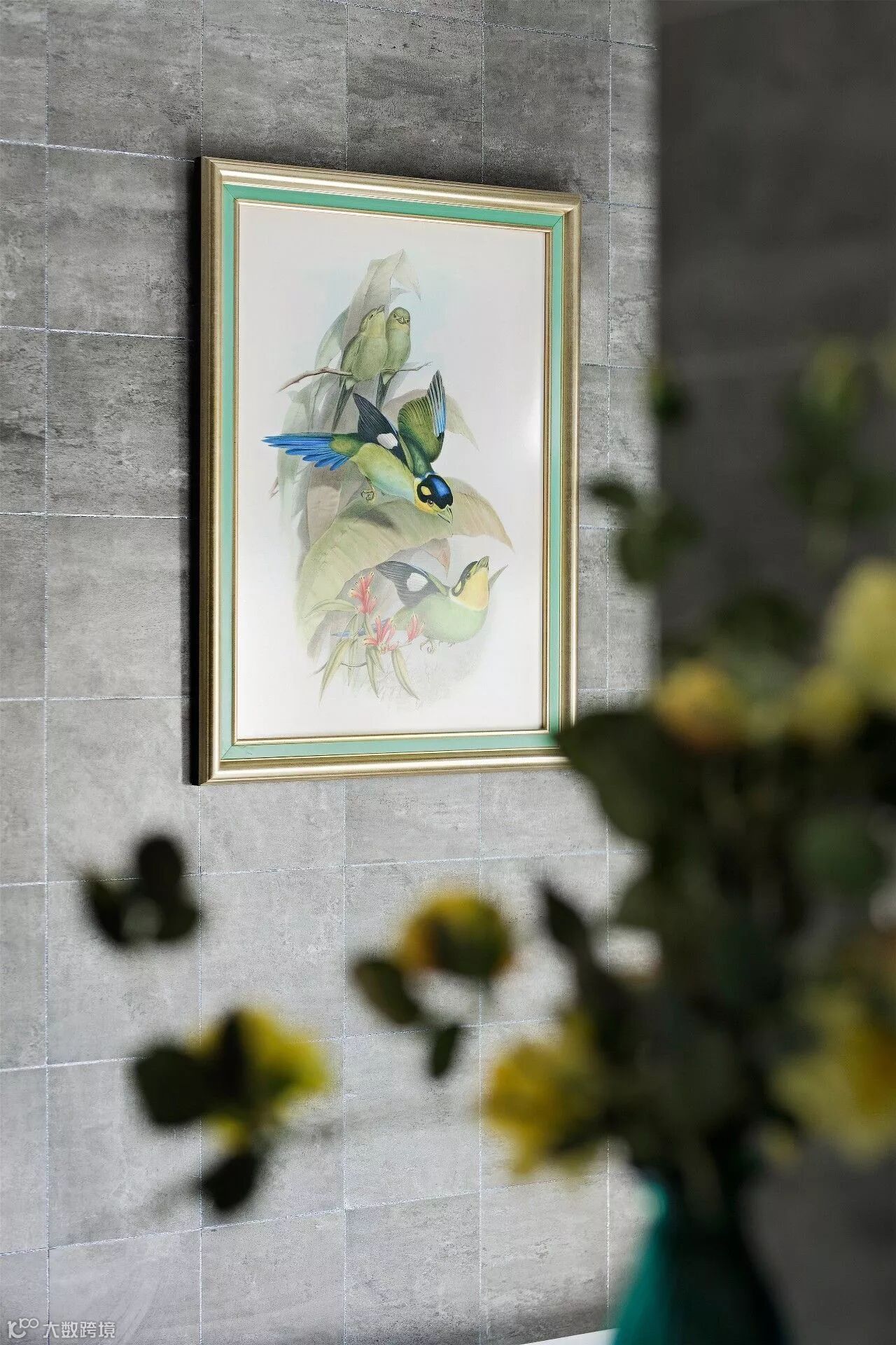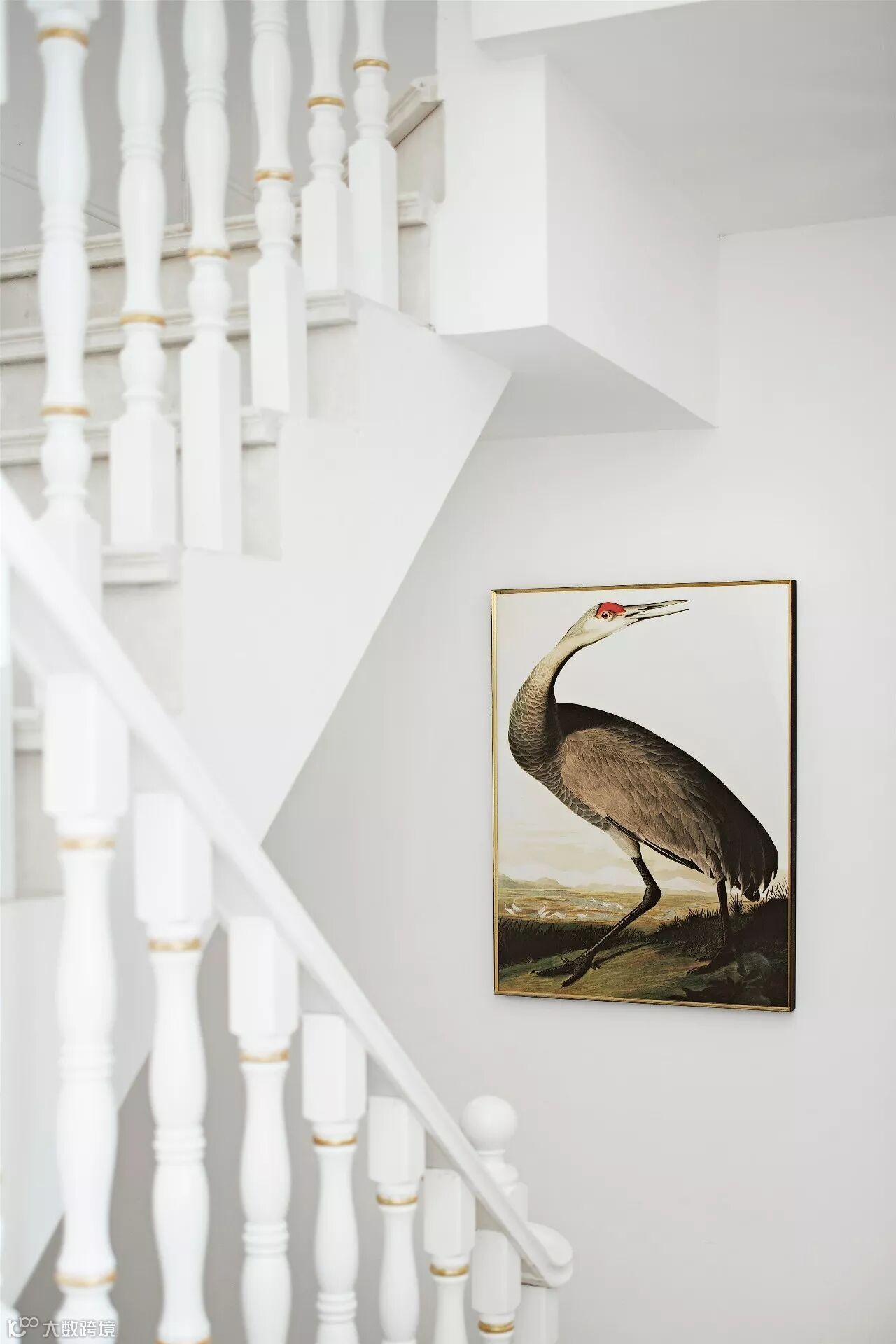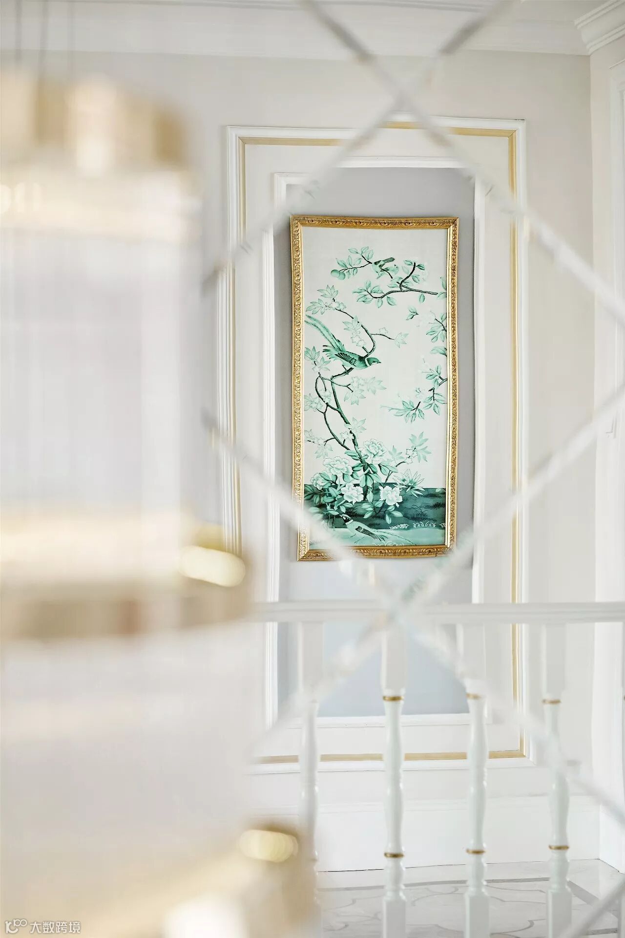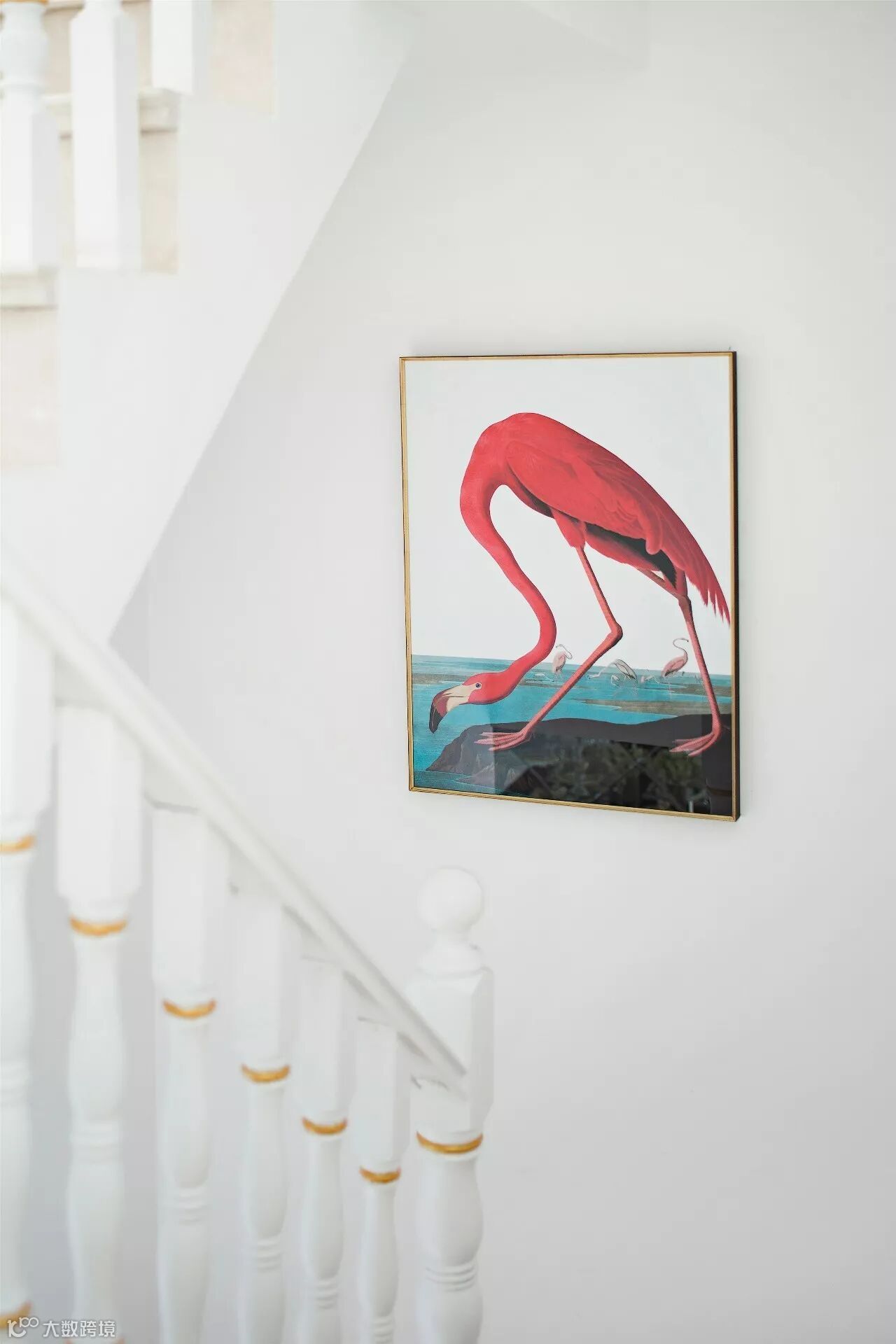 穿过餐厅,转角楼梯有热情的火烈鸟引领我们继续前行,行走间发现二楼长廊花鸟也映衬在了餐厅的镜面上,让整个游廊显得格外灵动。