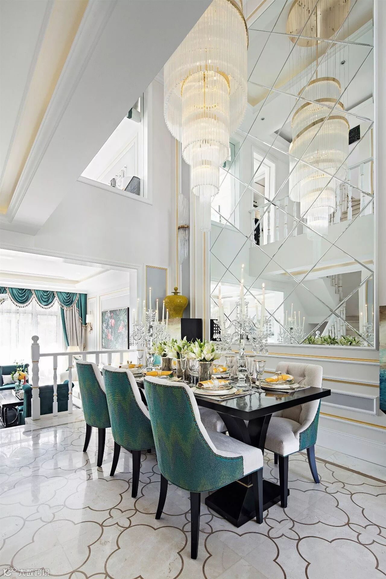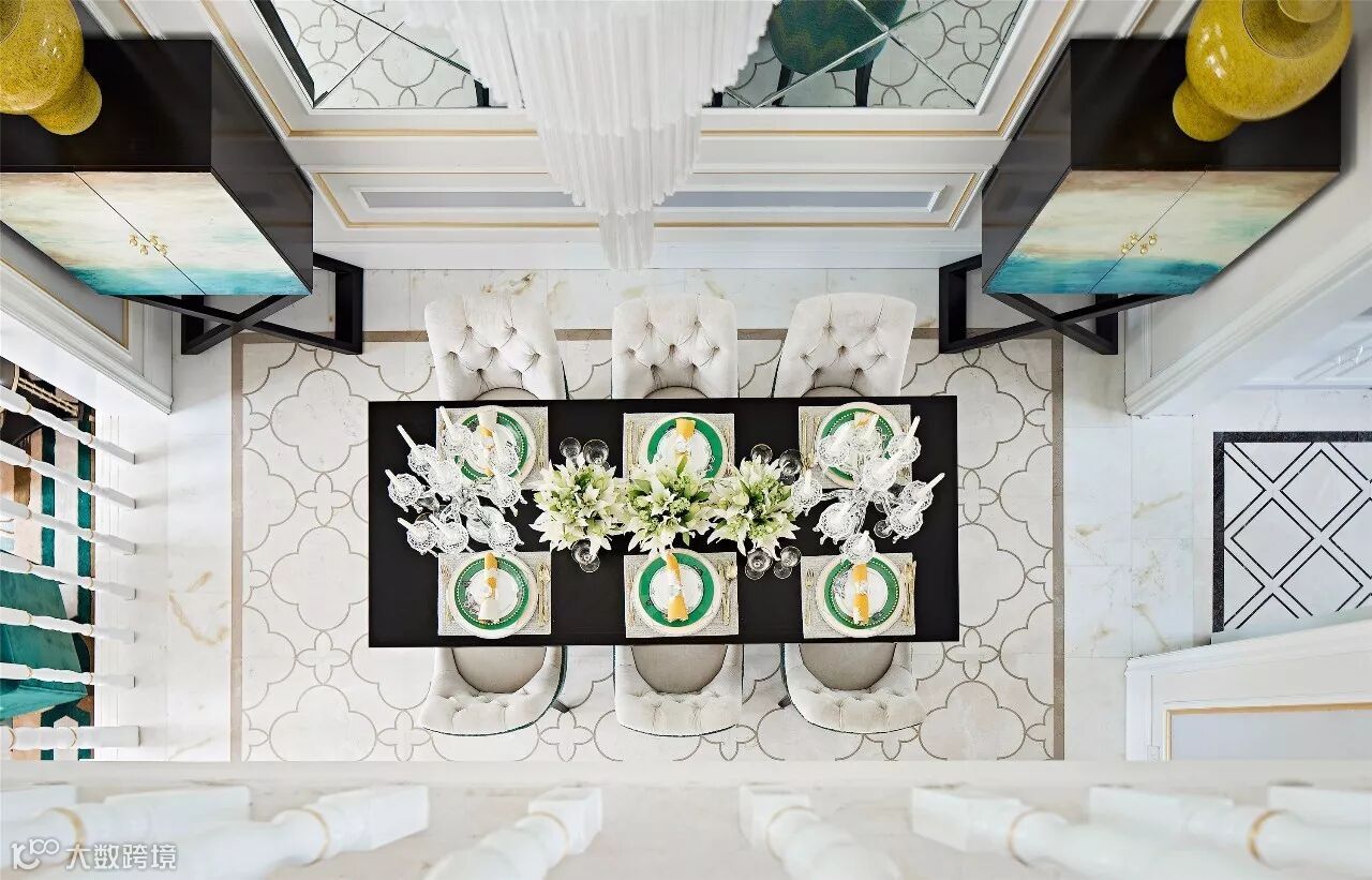 餐厅作为室内唯一的挑高层,必须承担起整个空间的大气与磅礴。一盏大型的装饰艺术灯提升了整个空间的气势,也点亮了整个空间的气质。
