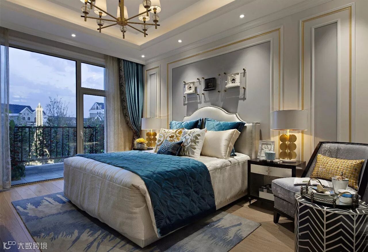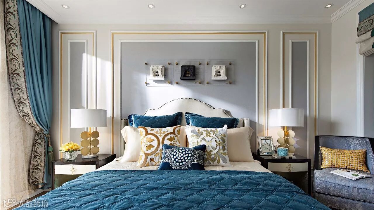 长辈房加入了沉着的蓝色系,花纹与图案也更加柔和淡雅。