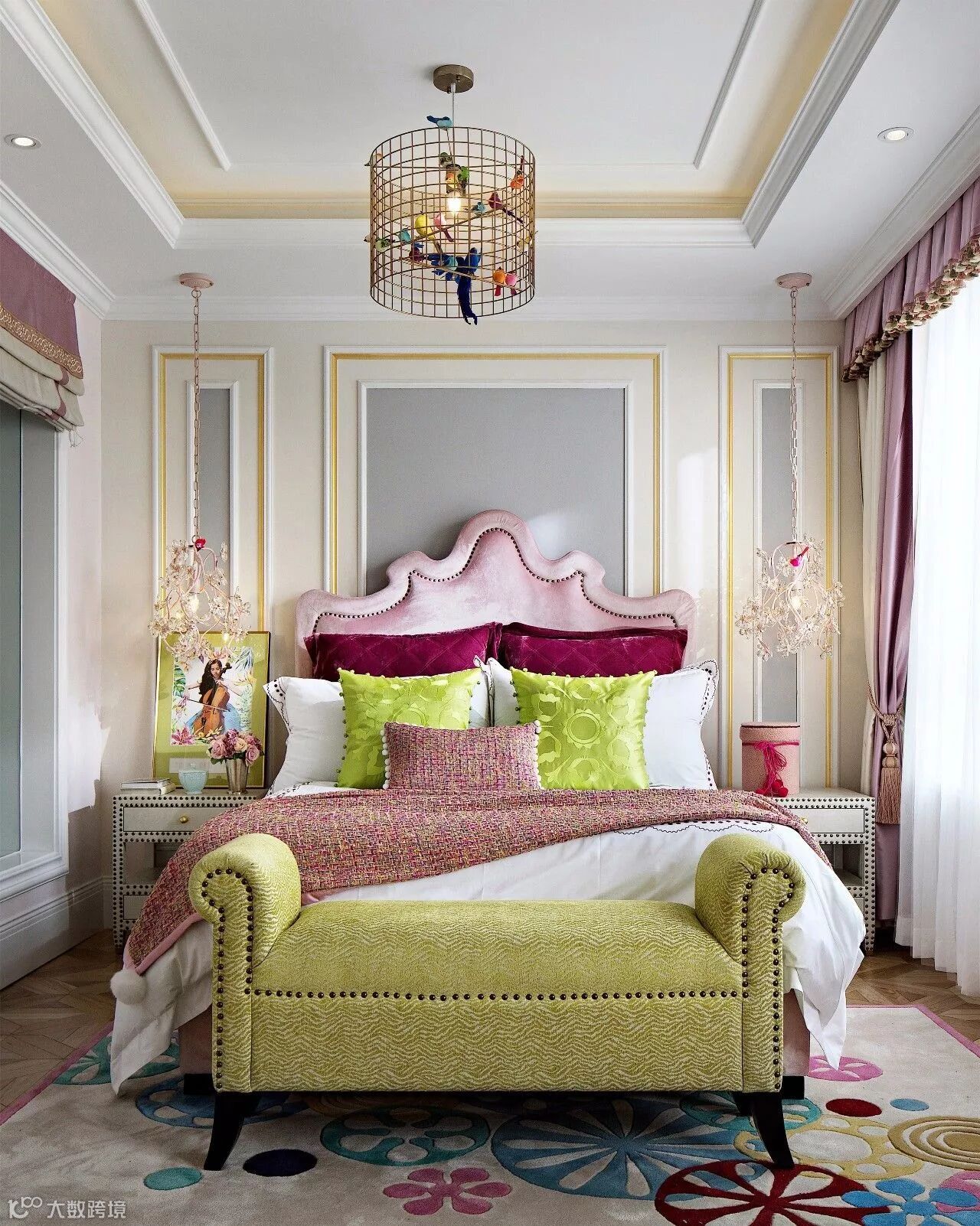 鸟笼灯上的鸟儿飞向各处,如果此时再演奏一曲,定能听到幸福的乐章。