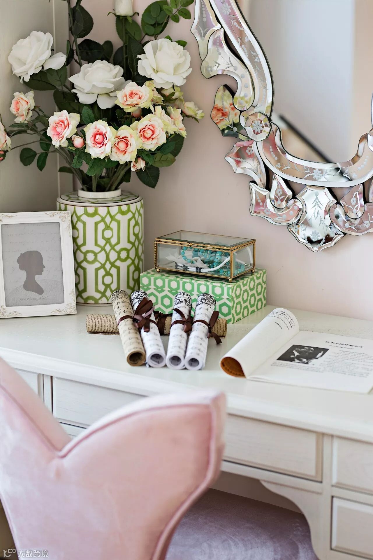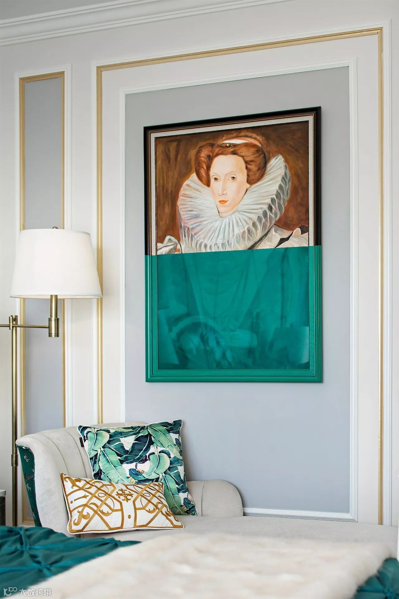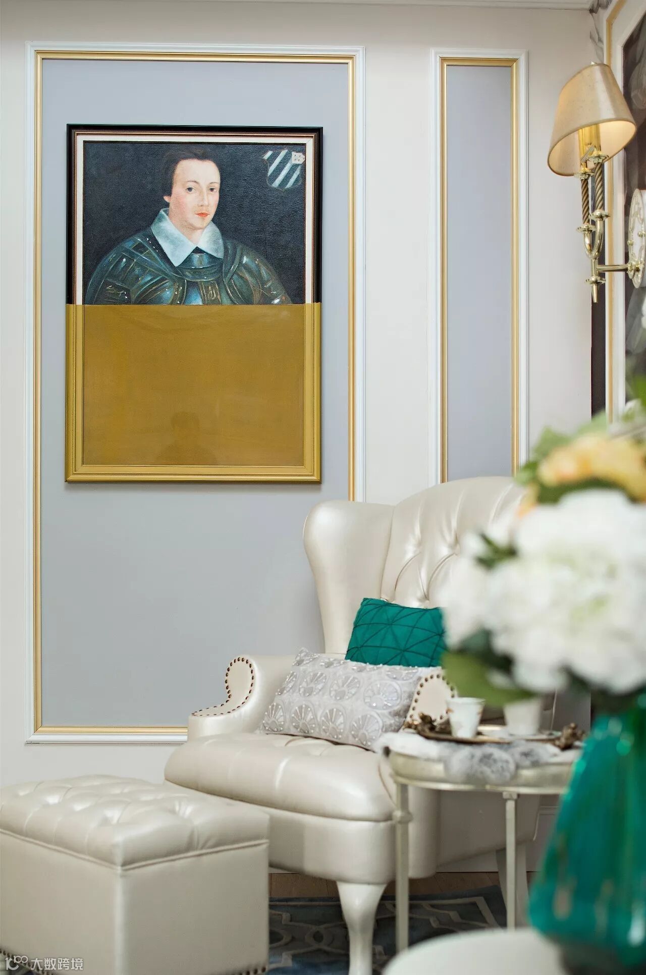 半身人像挂画、从背景墙落到白色少女肩上的鲜花,都是在以现代的手法致敬着古老的欧式。