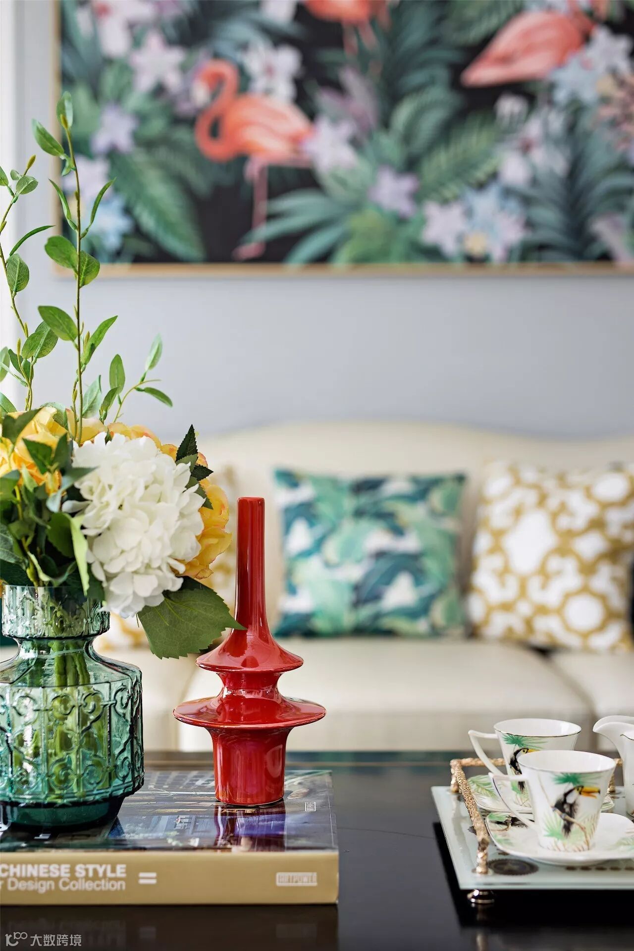 茶器上的花鸟图案也在无声呼应着整个空间的主题。