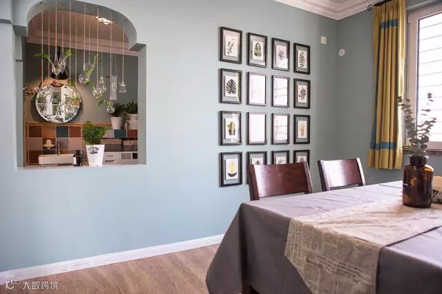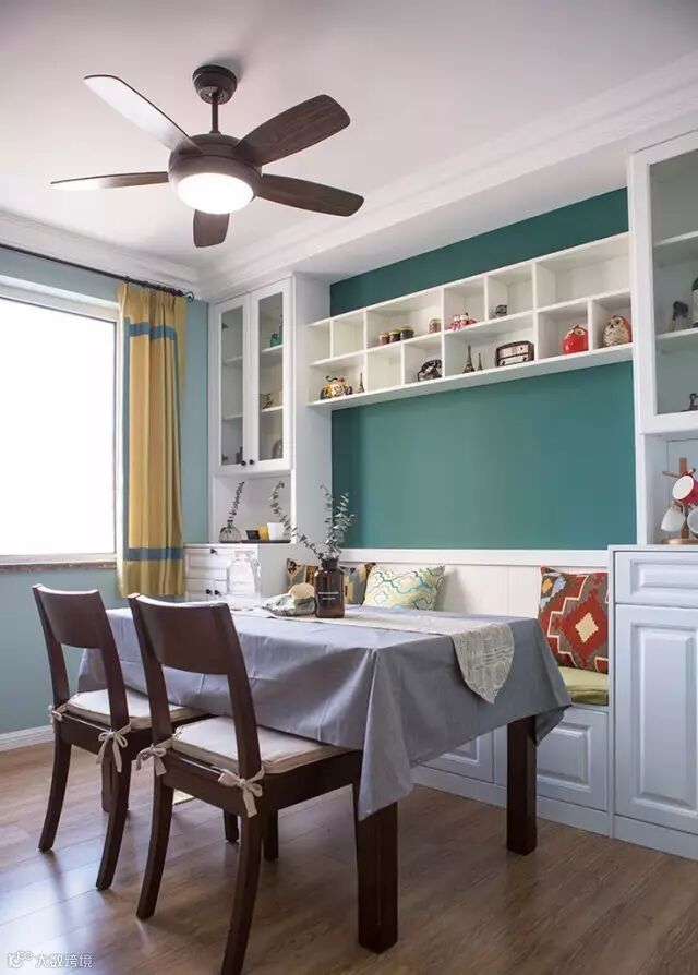 餐厅设置卡座,一体化展示柜设计,收纳、展示一面墙搞定。