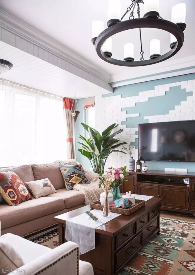 电视背景墙采用白色文化砖,没有按常规将整面墙全铺满。局部的留白充满趣味。