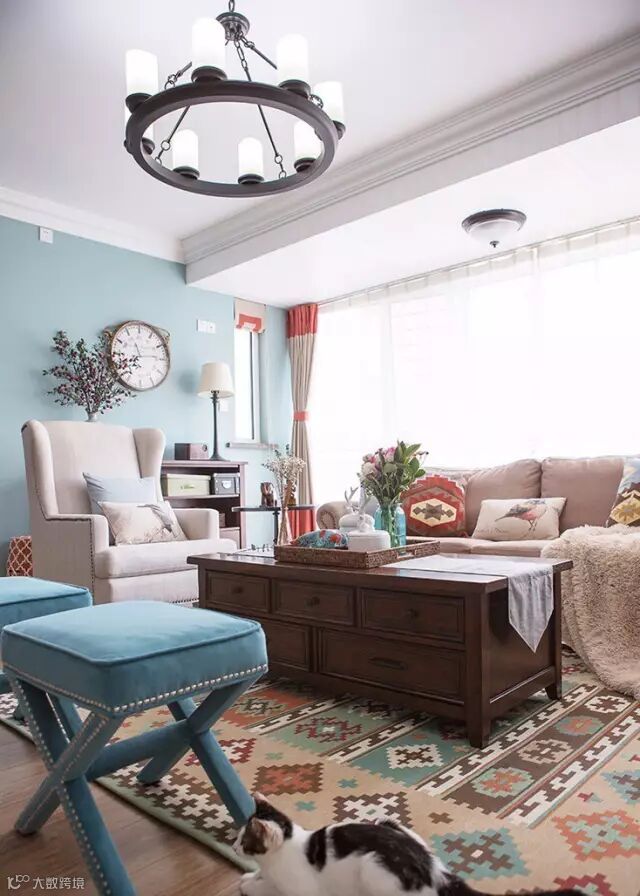沉稳厚实的茶几,更有安全。搭配孔雀蓝坐凳,时尚感满满。