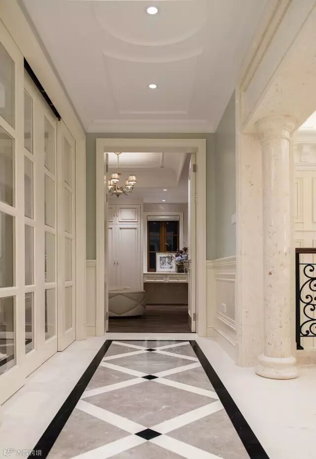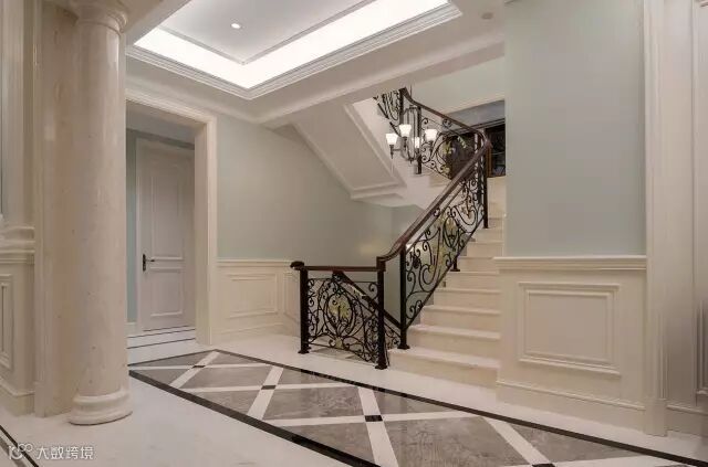 在与楼梯走廊衔接处利用罗马柱做简化的隔断处理,