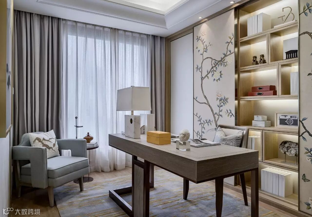 书房静室,雅致的书柜,一方实木书桌,一盏明亮而不刺眼的灯光,是精心的必备物品。巨大又有序的书柜可以容纳超大容量书籍,中式书桌座椅使整个空间的格调再上一层。安坐在这样的环境中,静静与自己的心灵对话。一隅居室,文字作伴,书香为伍,外界的动静再惊不起心中的一丝涟漪。