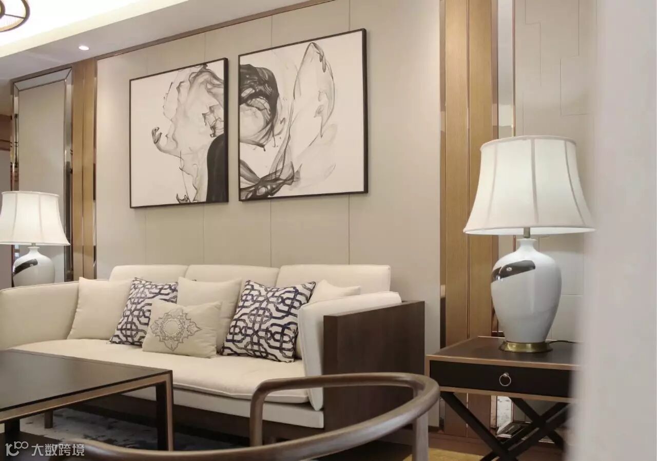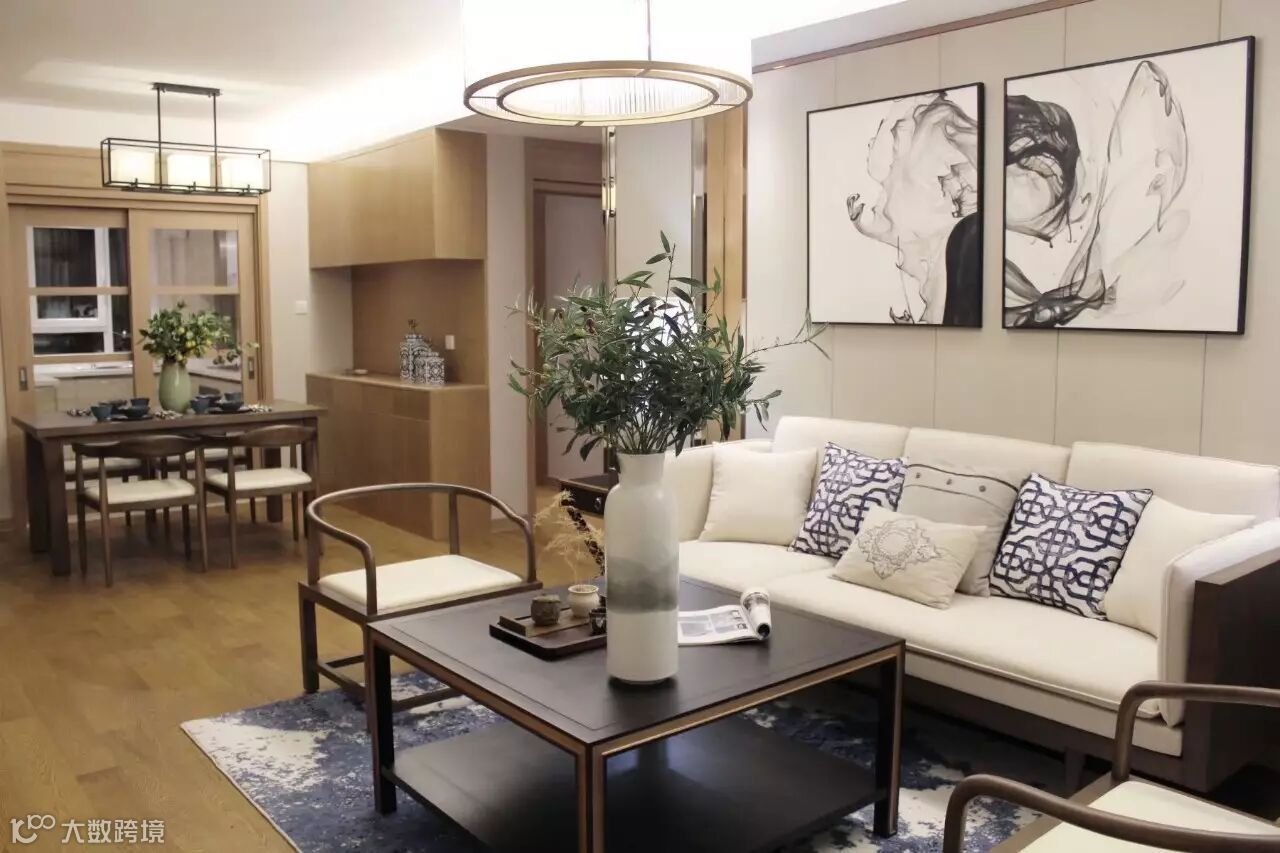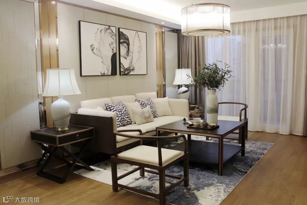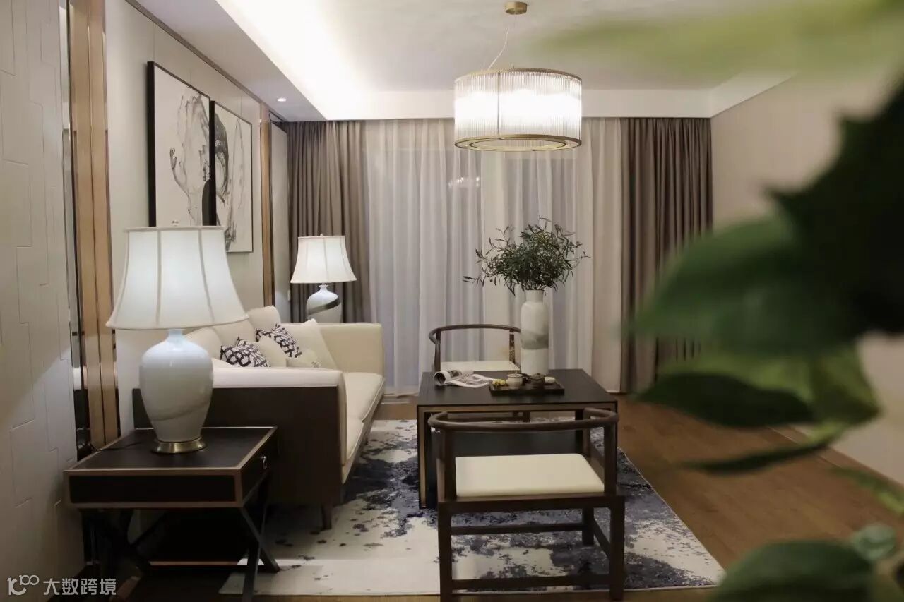 软装陈设中选择了现代新中式的家具风格搭配简洁精致的装饰摆件,