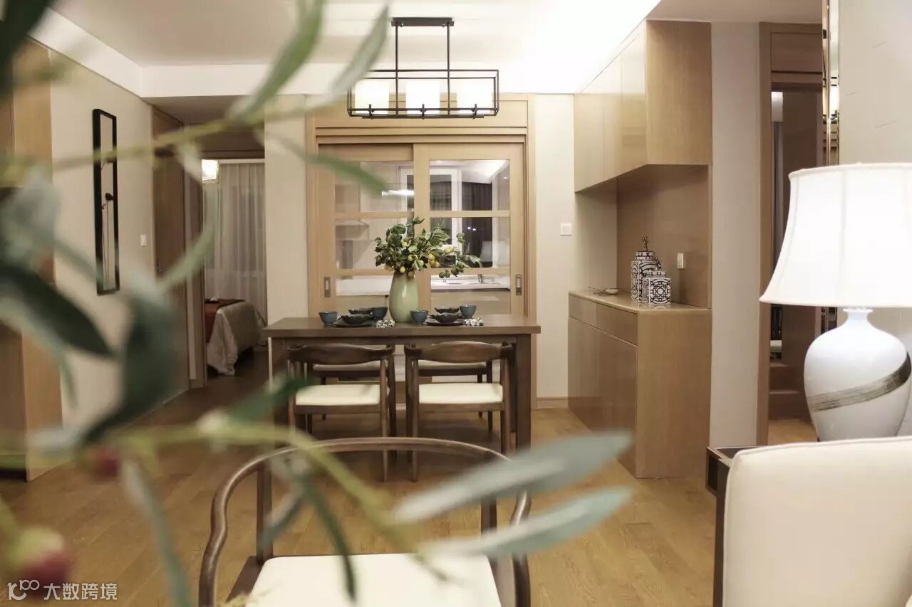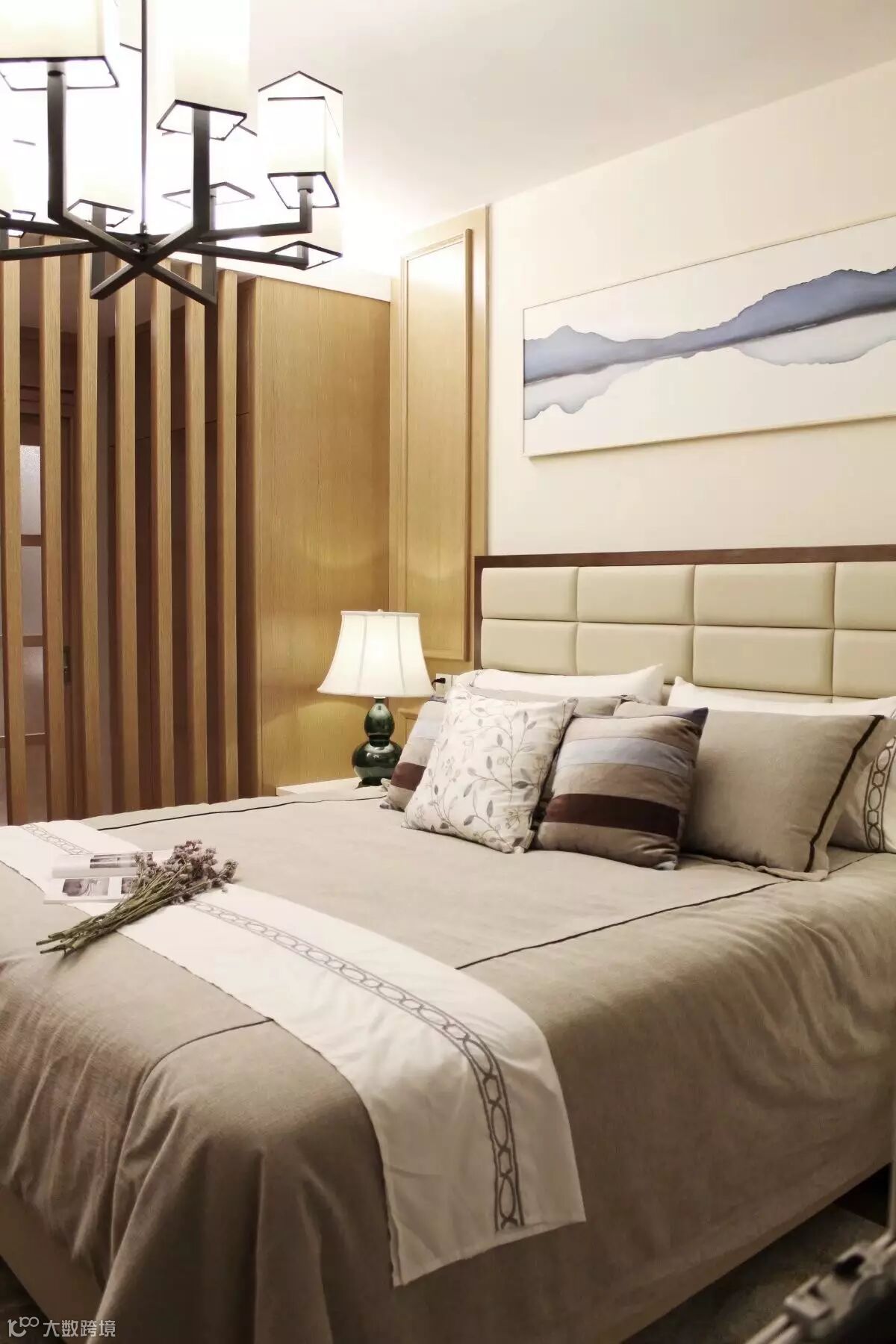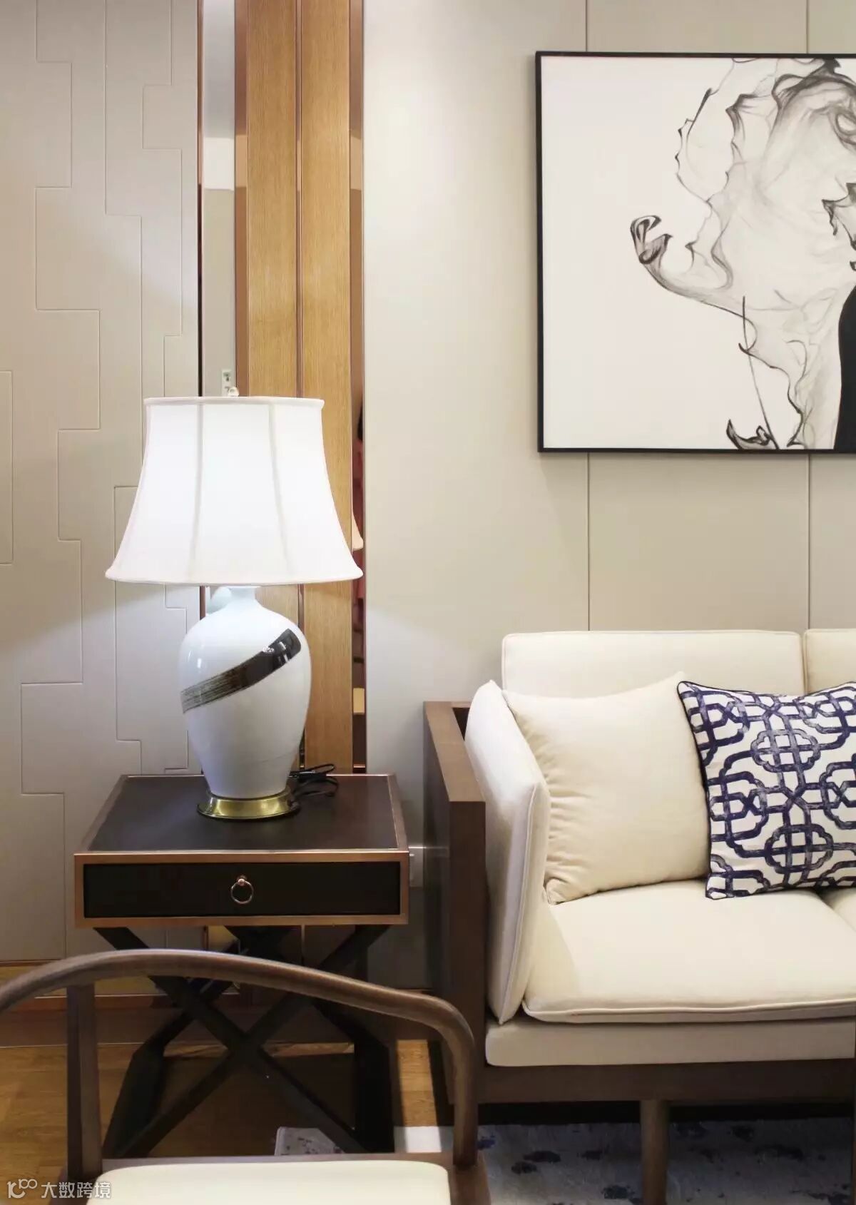 软装陈设中选择了现代新中式的家具风格搭配简洁精致的装饰摆件,