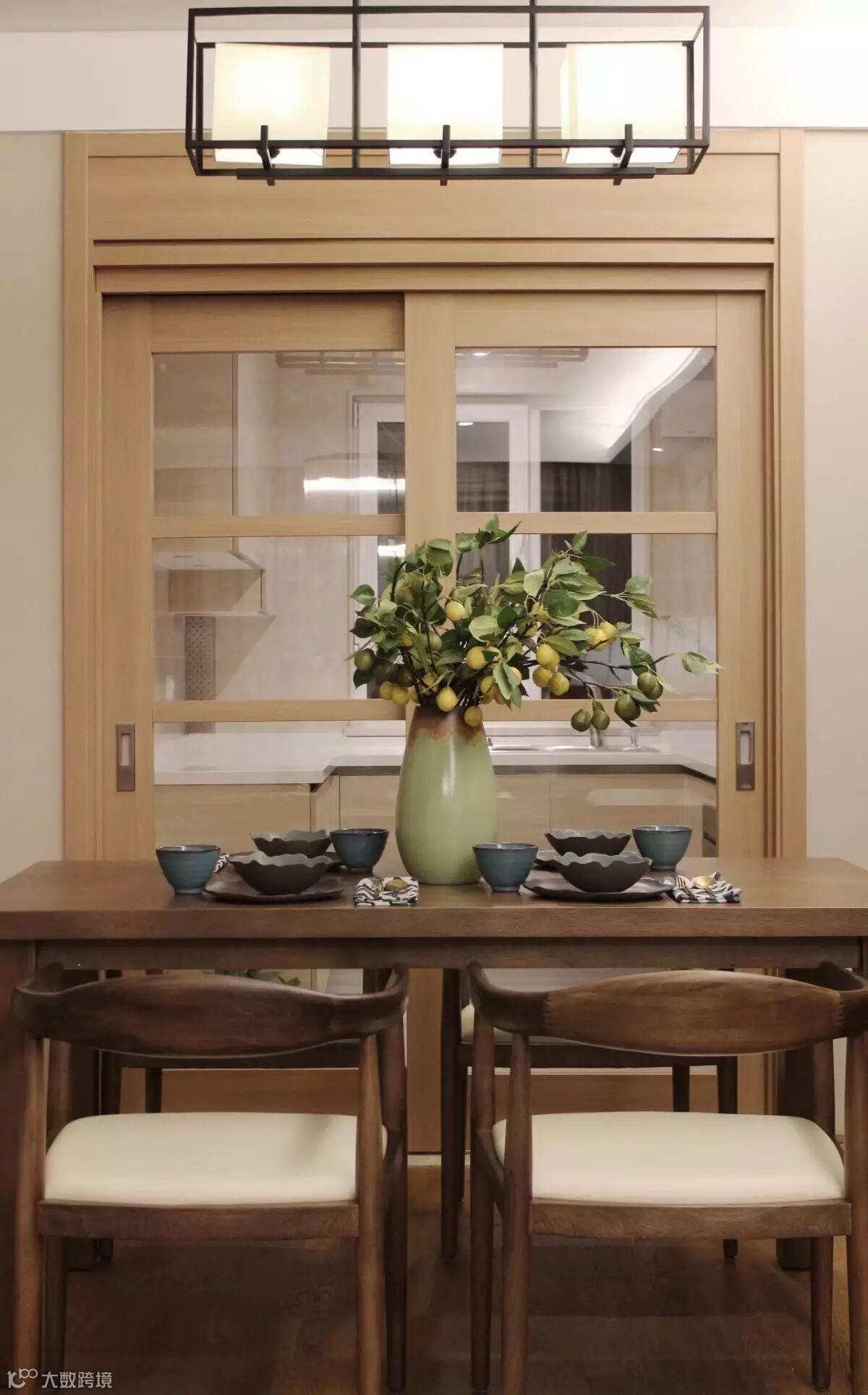 简洁大方的餐桌椅在头顶简单线条的吊灯映照下,