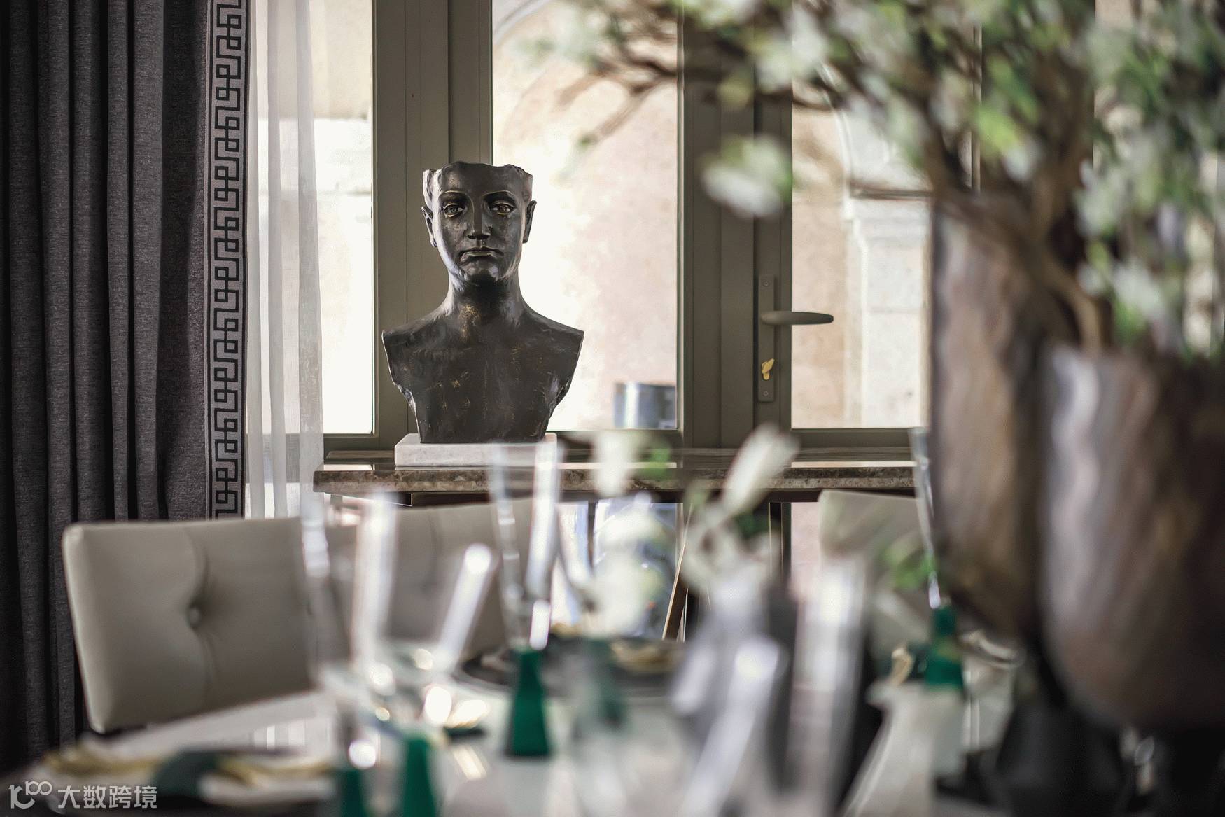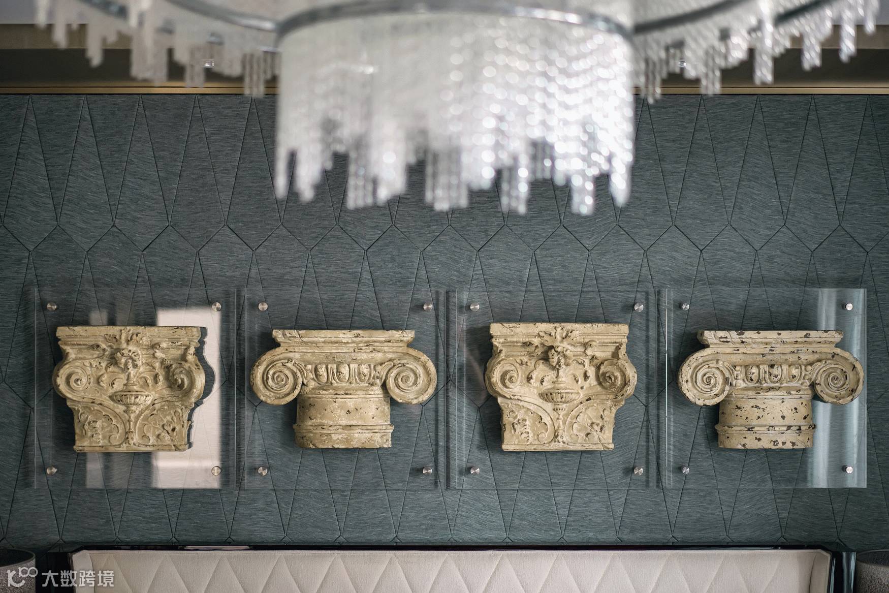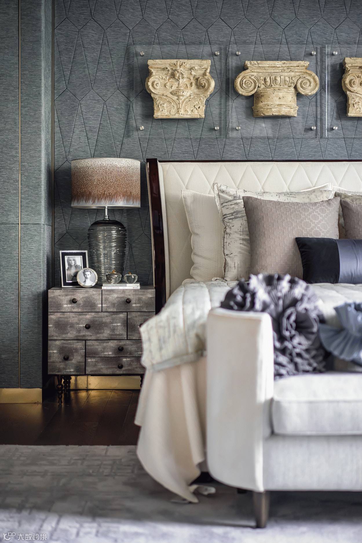 主卧的设计中,设计师将古旧粗犷的古罗马建筑元素提炼成了床头的艺术装置,用精巧的方式将宏大的叙事载入空间,克制的色系与浪漫的表达形成了东方和西方的对话。