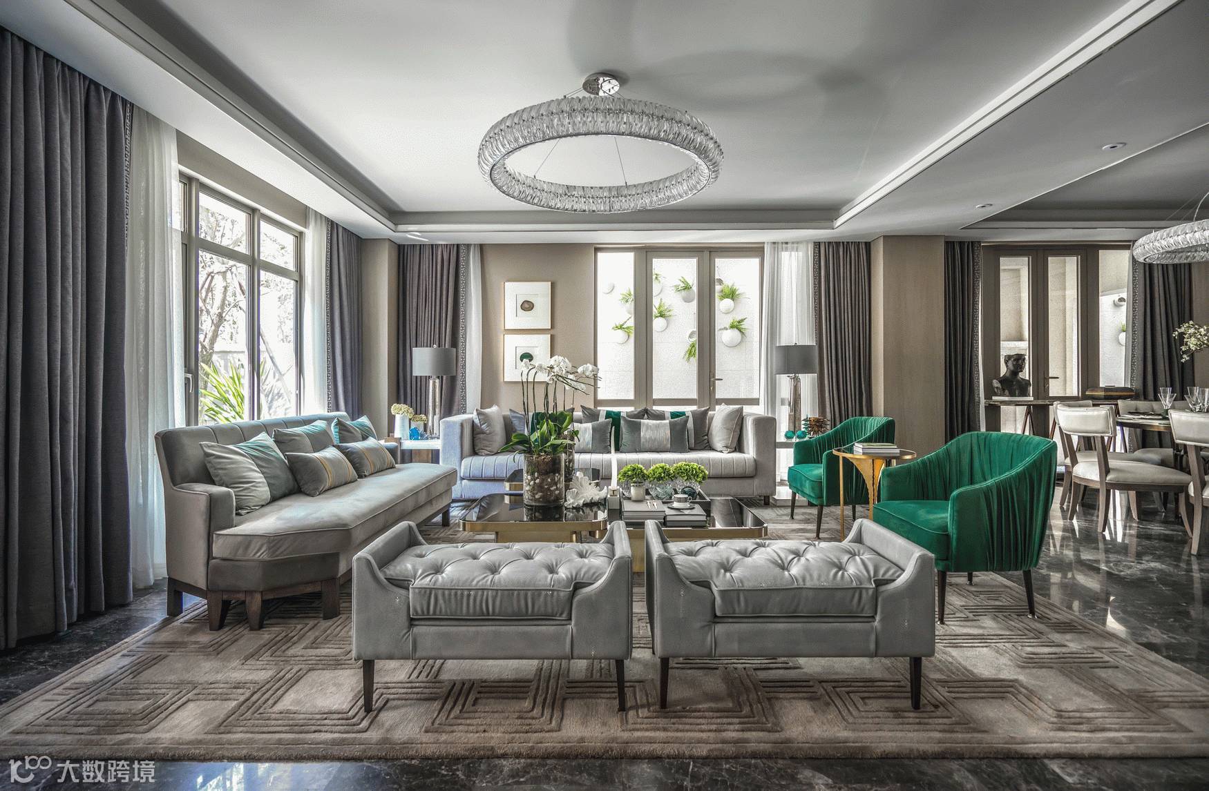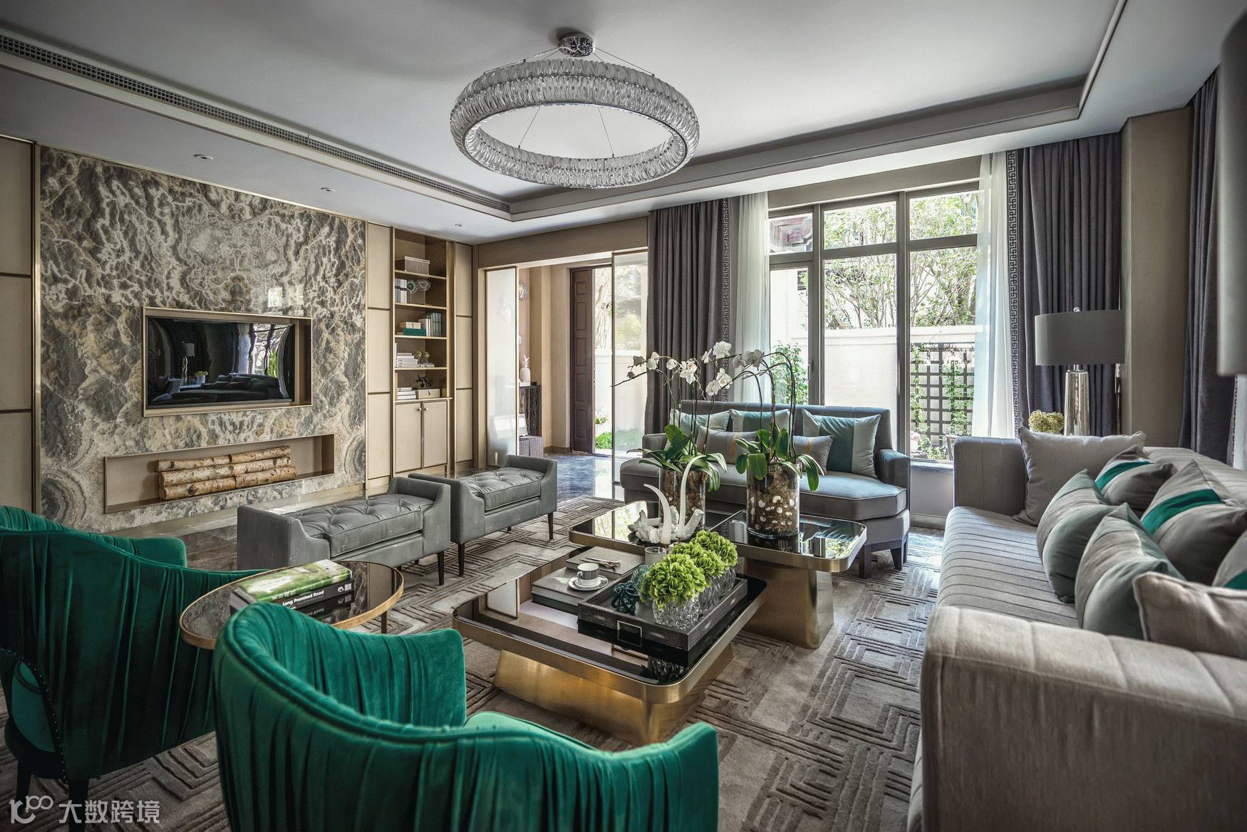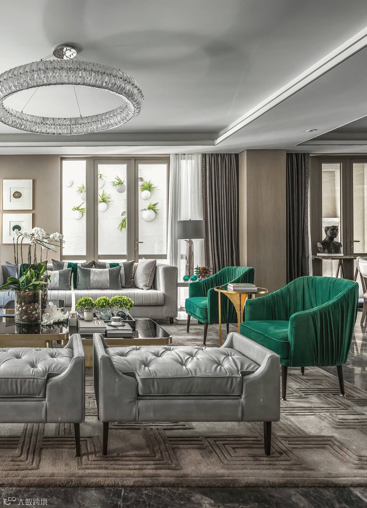设计以玉石之王翡翠的色彩,应用于灰色的主调空间,以丰富的家居配饰元素、鲜明的色彩层次及质感的材料运用,呈现了浪漫、灵动的空间之美,让这个五层的别墅呈现了绝美风华。