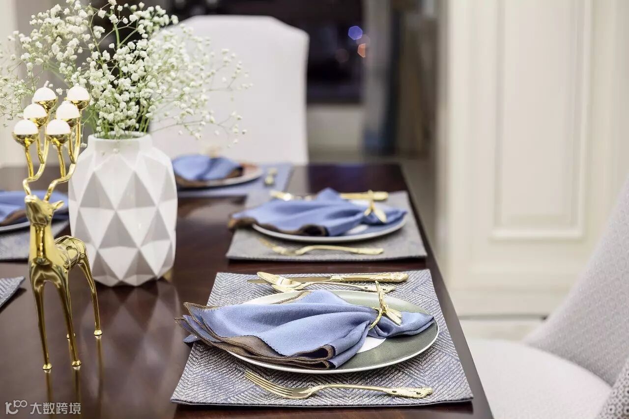 在用餐环境中,象牙白顶天立地,让视觉集中在一方胡桃餐桌,顶棚一盏香槟金的玻璃吊灯,将温馨柔和的光晕洒落在精致的摆盘上,让皇家蓝与胡桃色相得益彰,驯鹿的烛台愈加活泼灵动;无论春去秋来还是雨雪更迭,一束应景的桌花,都能将优雅的气息展现的淋漓尽致。
