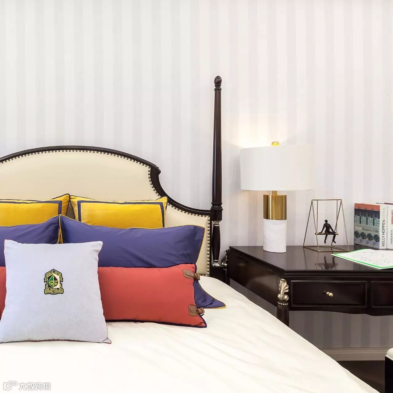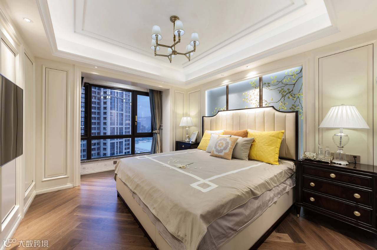 主卧室象牙白的墙板简洁大方,胡桃木的家具细腻稳重,灰蓝色的背景与明黄色的抱枕成为空间最鲜明的色彩对比,夜间点亮一盏床头灯,洒落几瓣白玫瑰,温馨浪漫的情愫便缓缓晕开。