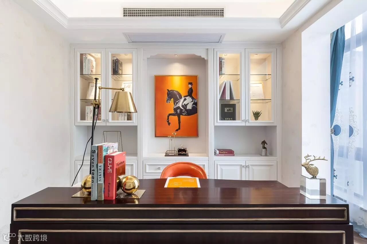 书房的整体背景墙兼具了收纳与展示,胡桃木色与爱马仕橙的搭配,成熟稳重的同时不乏热情张扬,香槟色的灯具、配饰以不同的形式状态呈现,给工作空间增添许多贵而不奢、稳而不闷的惬意氛围。
