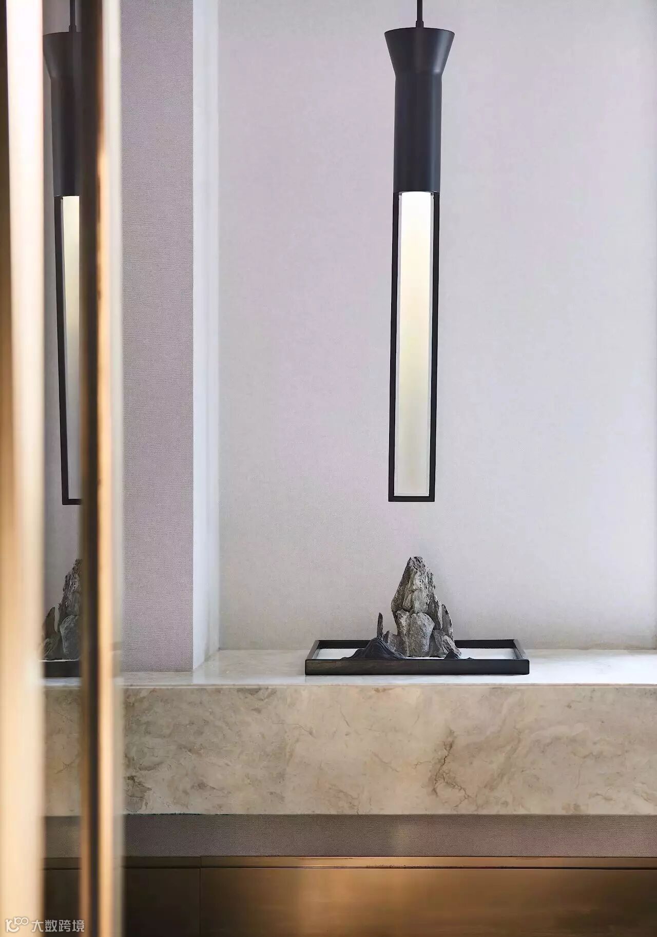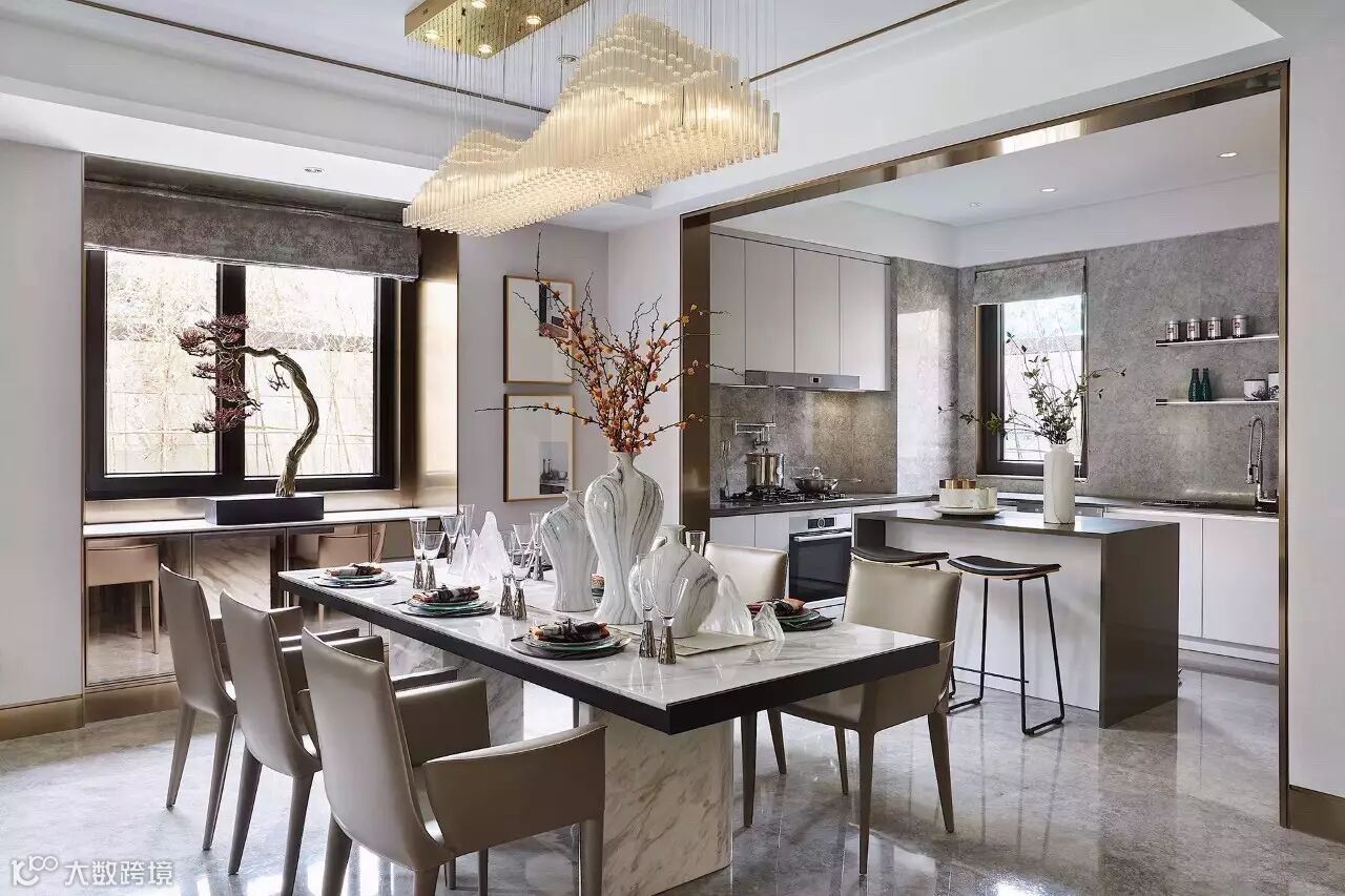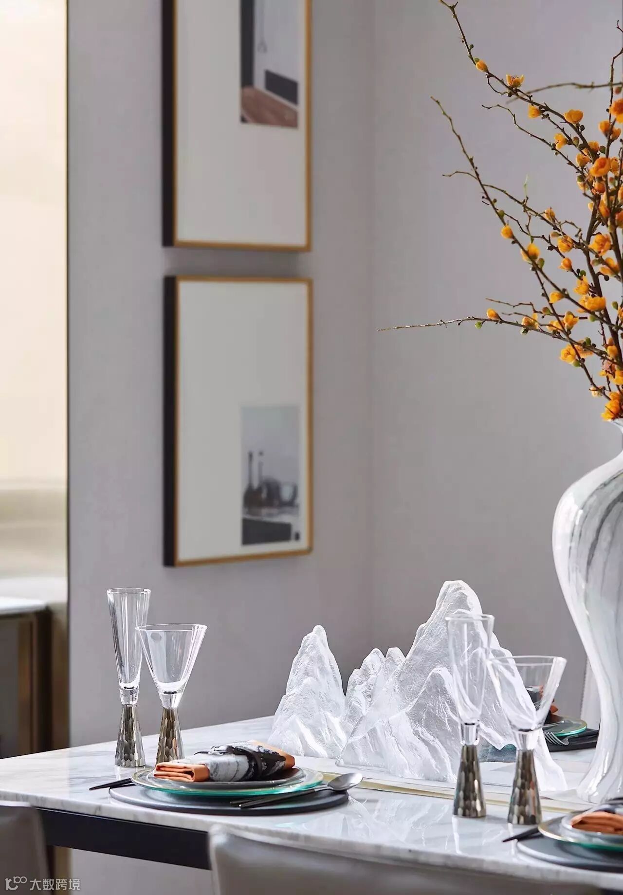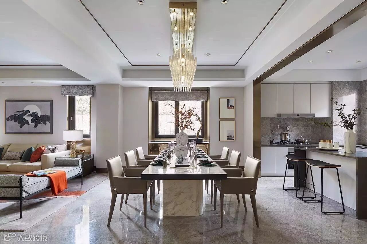 山形元素的吊灯赋予了这个餐厅别样的气质,餐具的摆放,采用更加艺术化的形式,呼应整个居所的格调。饰品选择上,植入枯山水等元素、极强的现代感与东方美学结合,呈现出品质与艺术的和谐统一。