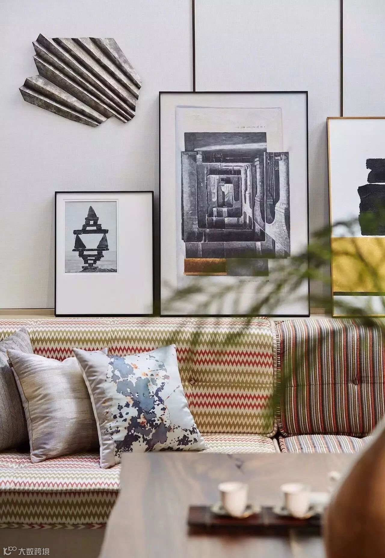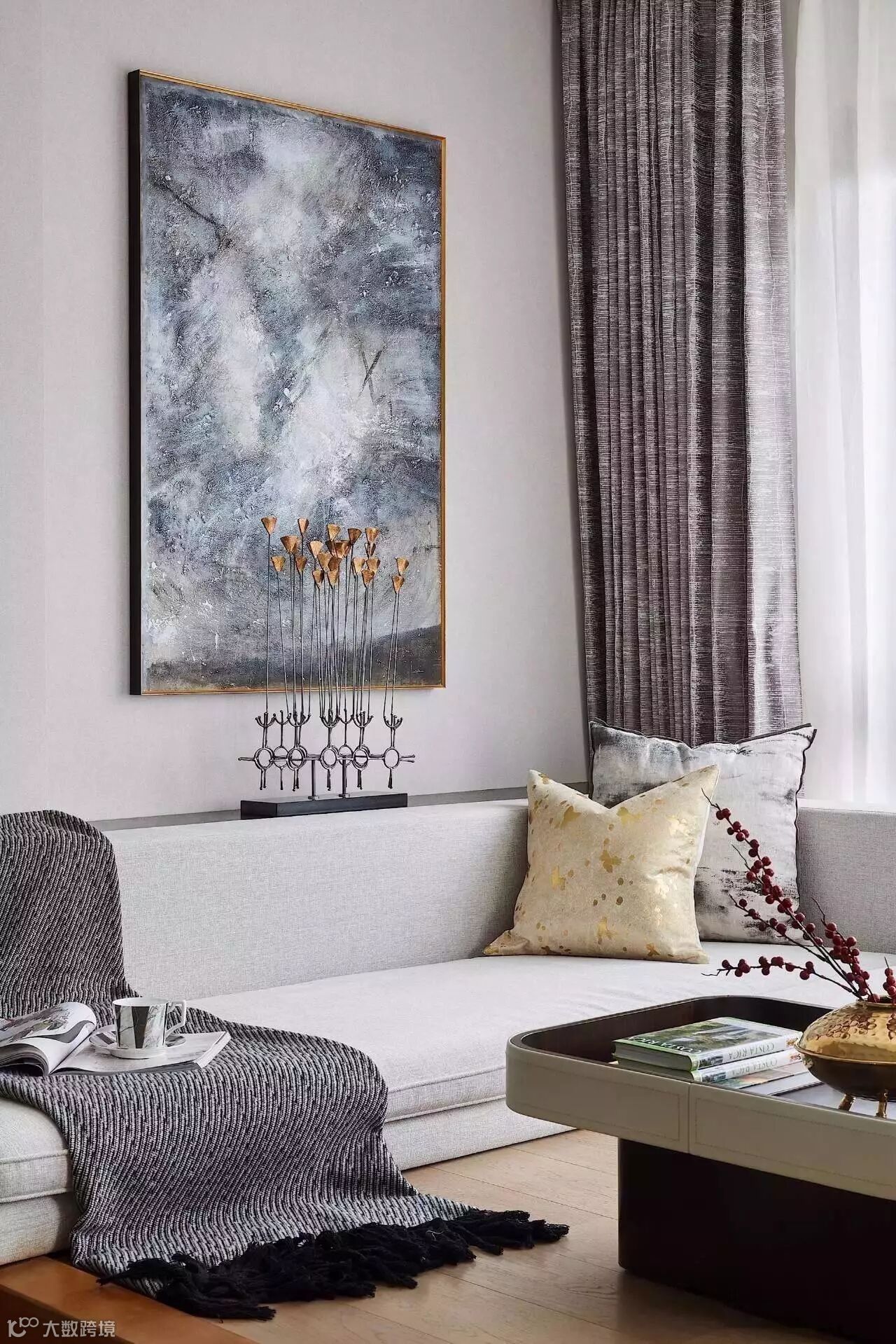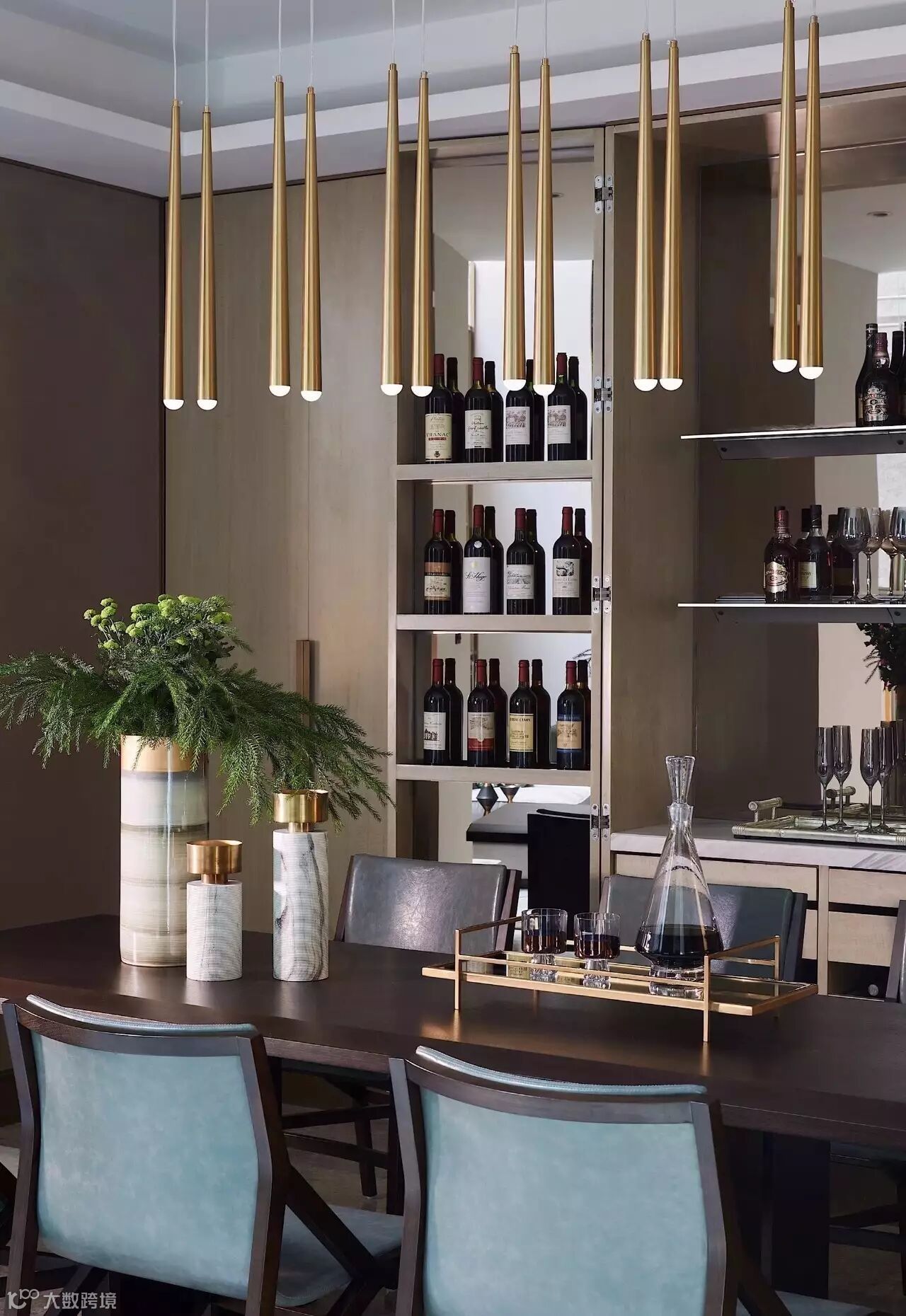 山形元素的吊灯赋予了这个餐厅别样的气质,餐具的摆放,采用更加艺术化的形式,呼应整个居所的格调。饰品选择上,植入枯山水等元素、极强的现代感与东方美学结合,呈现出品质与艺术的和谐统一。