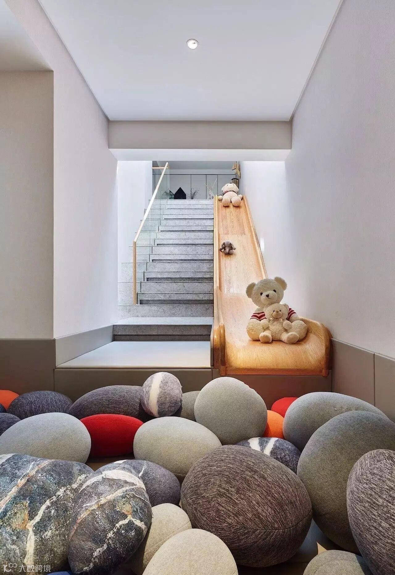 值得一提的是,负一层通过一个充满童趣的滑梯与负二层相连,为孩子们构建了一个玩乐的天堂。不远处则是以攀岩墙的设计,将孩子的活动空间从地上巧妙地挪到墙上,节省了空间。在这样的功能布局上,孩子和家长有了更高的互动性。