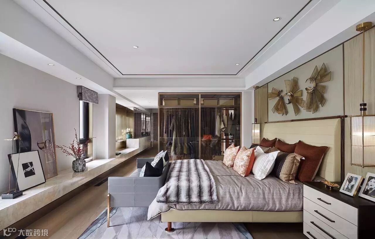 主卧室是主人私密与尽情放松的地方,以或深或浅层次的灰色及凹凸质感的布艺自外而内导入,恰到好处点缀的橘色,令室内装置与材质建构的语汇之间,产生一种与简单、纯粹、舒适共鸣的对话形式。