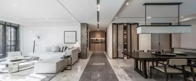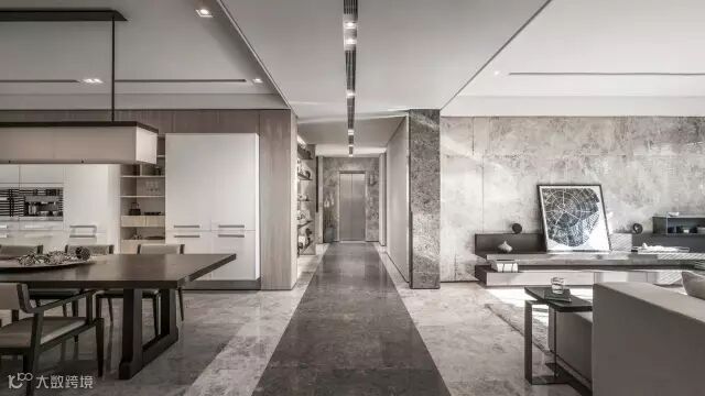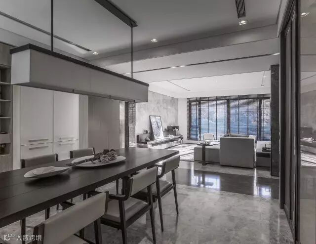 客、餐厅以材质间相互对比与高低天花的错落,区分空间使用功能,打破格局界限,强调视觉划分的趣味性。