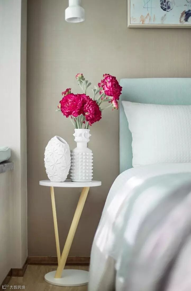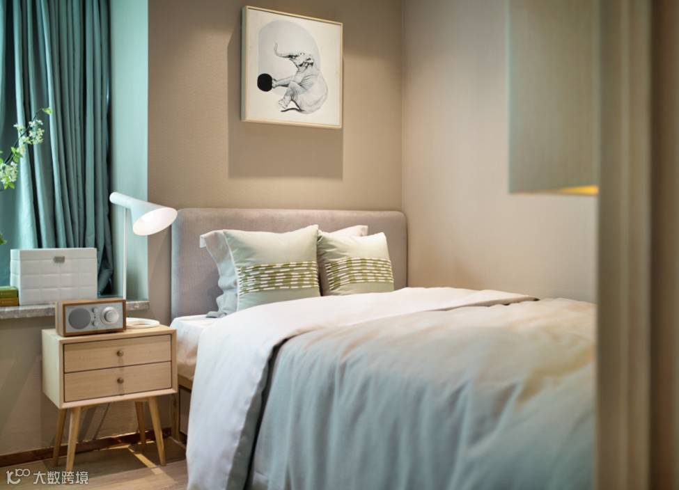 搭配菠菜绿植物靠包及素雅色系床品