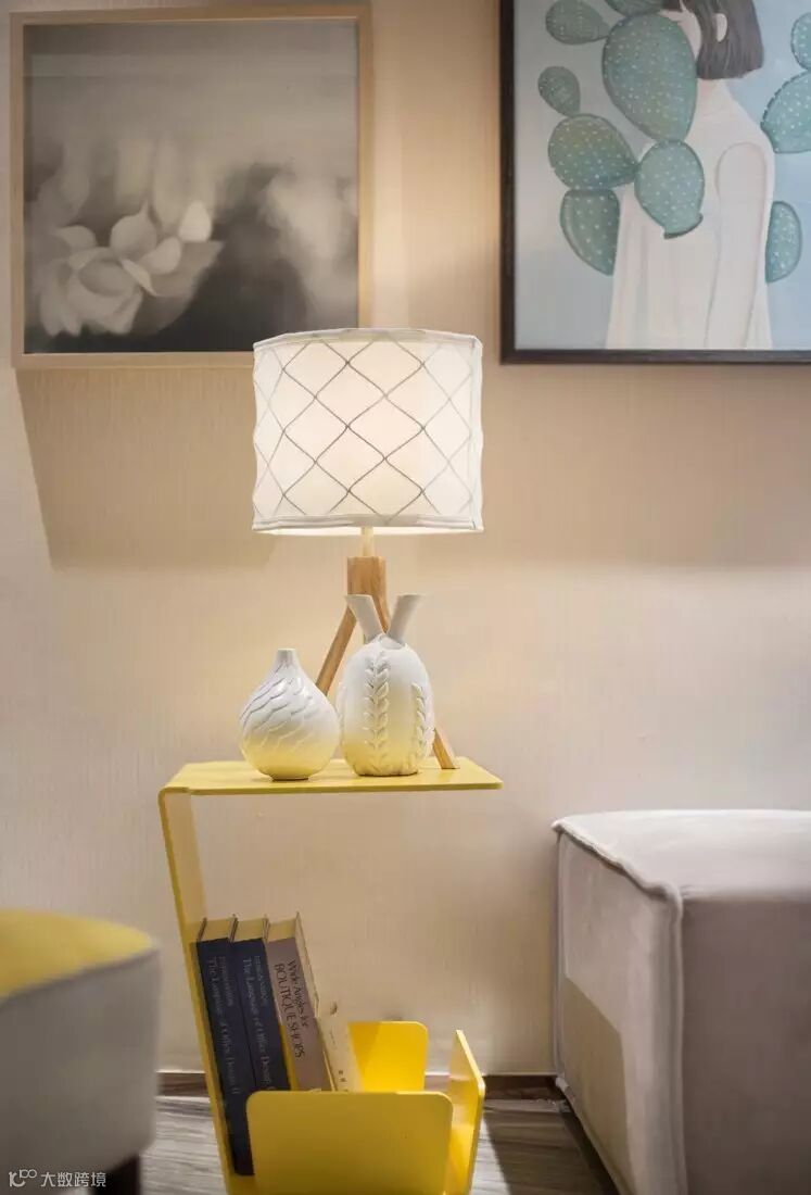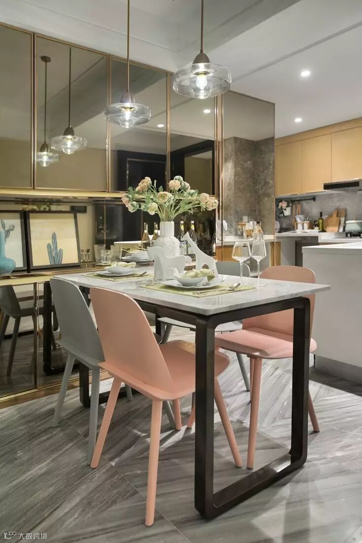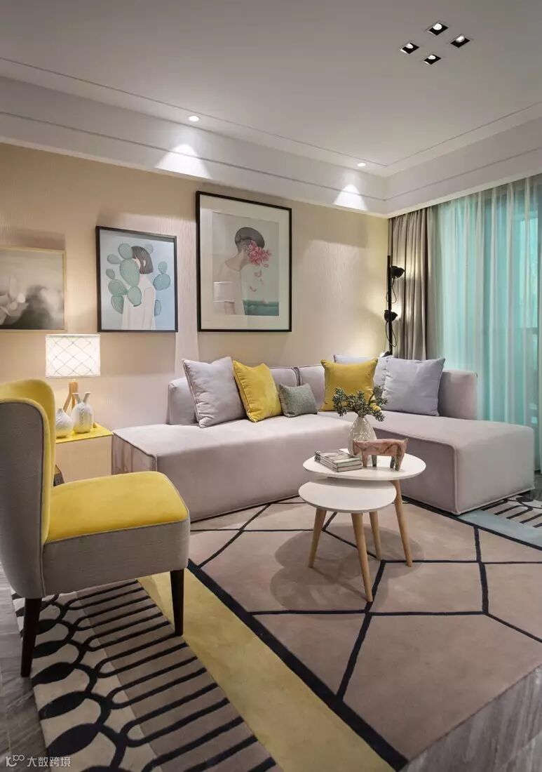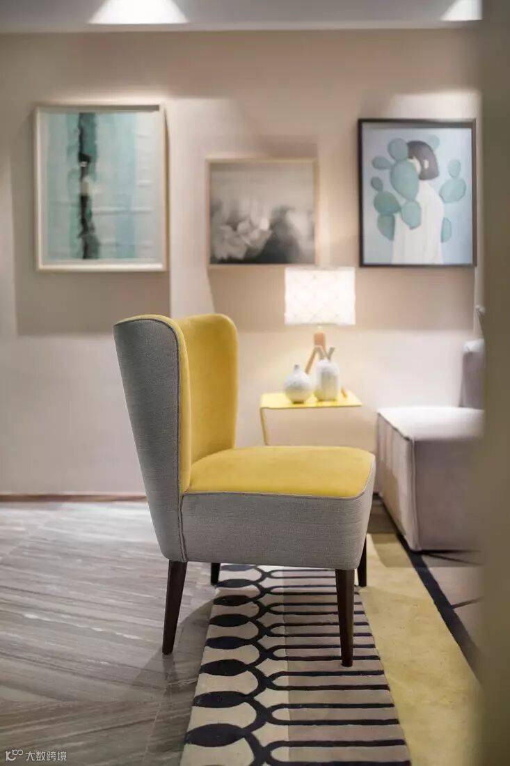 淡雅而甜蜜的奶油黄色与细腻柔和浅松石蓝的搭配让我们轻易想起冰淇淋的细腻和甘甜,柔滑的口感中,一丝清凉跃跃而出。冰川灰色沙发与奶油黄单椅过渡着空间的色调,使空间的层次愈发明显。