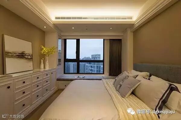 一整列的收纳与床尾电视柜的利用,满足了两人的衣物收纳,女主人的梳妆台镜面后方,利用建筑结构中的收纳空间,再多的瓶瓶罐罐都能随手置入。