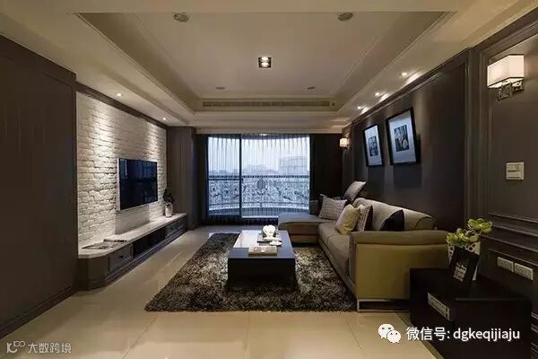 现代简约风的布艺沙发搭配深灰色的地毯、茶镜饰面的茶几,再加上几个靠枕的点缀营造出温馨的客厅空间。