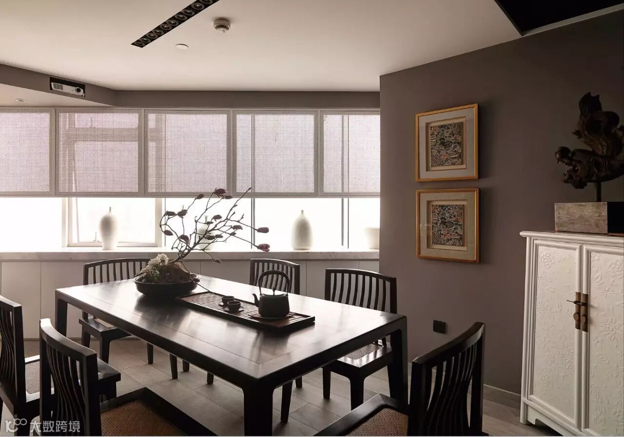 初入玄关,一目了然的中式意境就让人颇为惊喜。步入客厅,干枝的小景,淡淡的禅味,让浮躁的心静下来。当代原创艺术画作清新脱俗,从生活中获取鲜活的艺术感受并从传统美学方法中汲取巧妙的构成元素,完成了一次传统回归。客厅空间以木作生雅致之魂,木案、木地板、木柜,搭配简约的沙发与纯色的抱枕,相映成趣。临窗设有小憩坐台,厅内厅外风景独好,是抚琴冥思的好处所。主人收藏的铁壶、瓷器、佛像更给人带来自然人文古意。