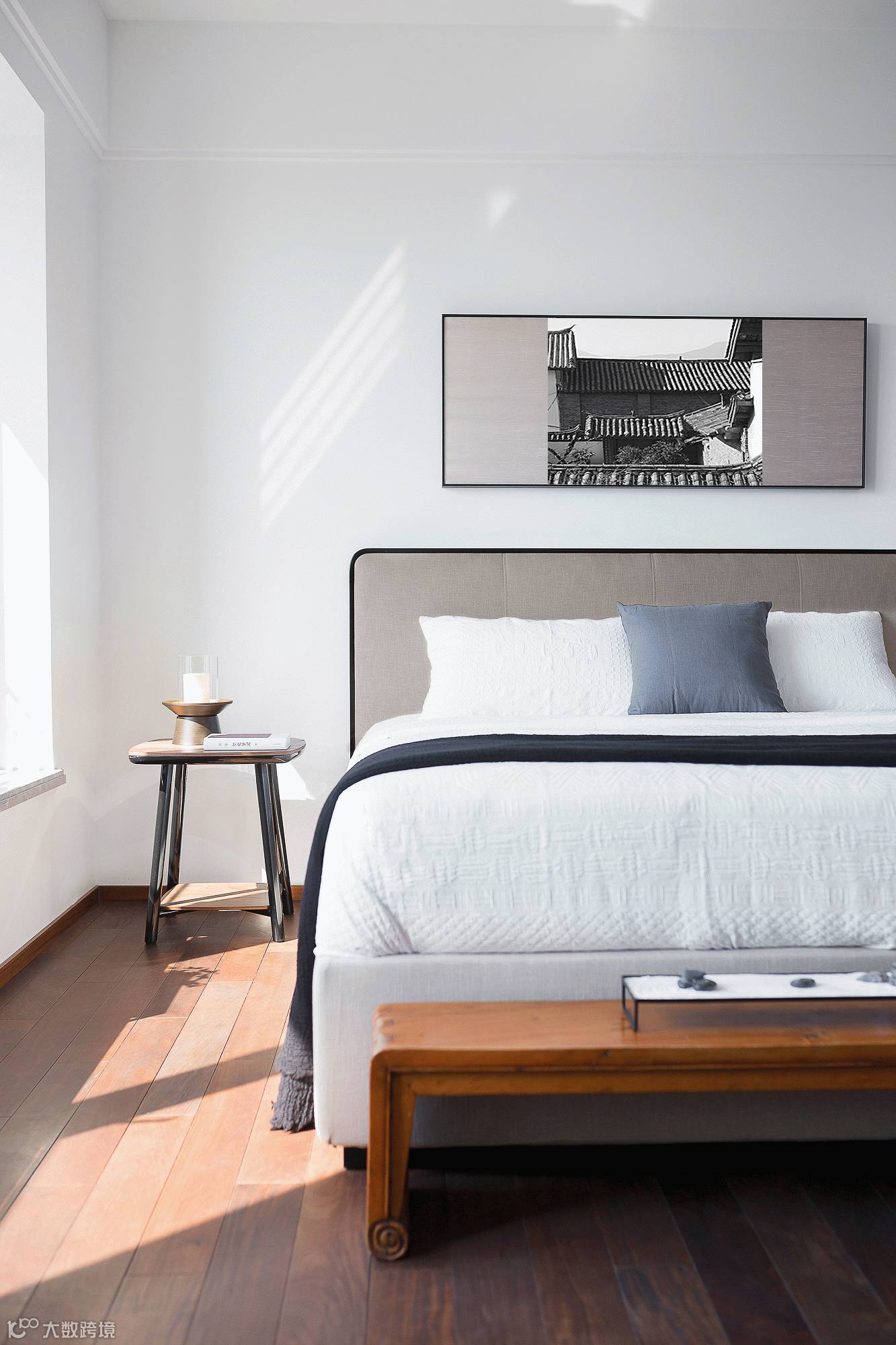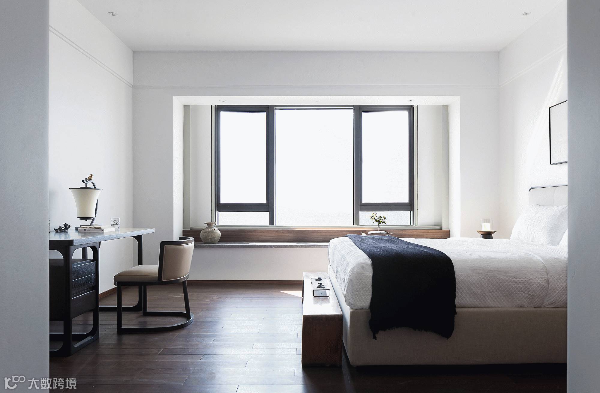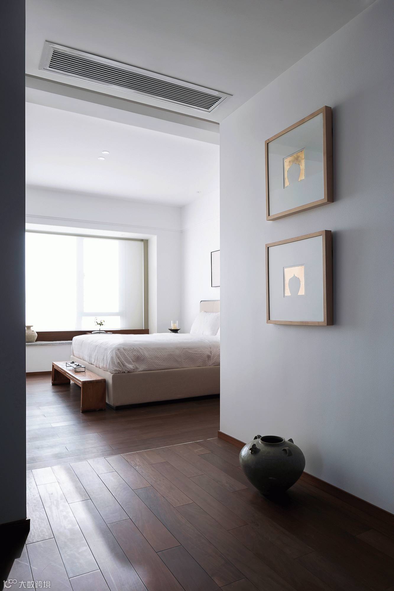 主卧设计从传统艺术形式的留白、简约、隐喻中提取灵感,拓宽空间的层次布局,予人以想象余地;沿用简练、雅致的设计笔触,结合朴拙的物件,形成视觉上的碰撞与冲突,以情寄物,以物传情,赋予空间灵魂,更强调卧室空间艺术意境的营造,虚实相生自然皆成妙境。在恬淡虚无的笔墨韵律中,完美演绎当代设计的纯粹精神。