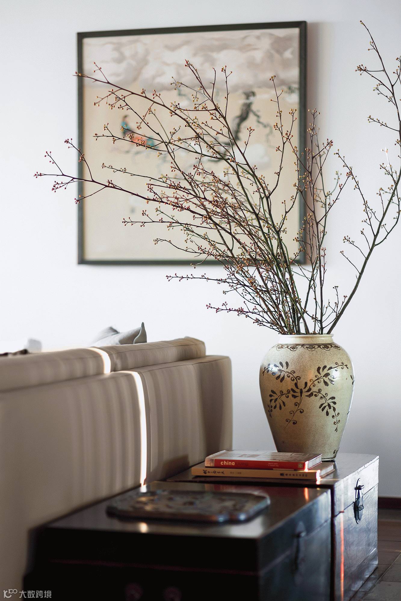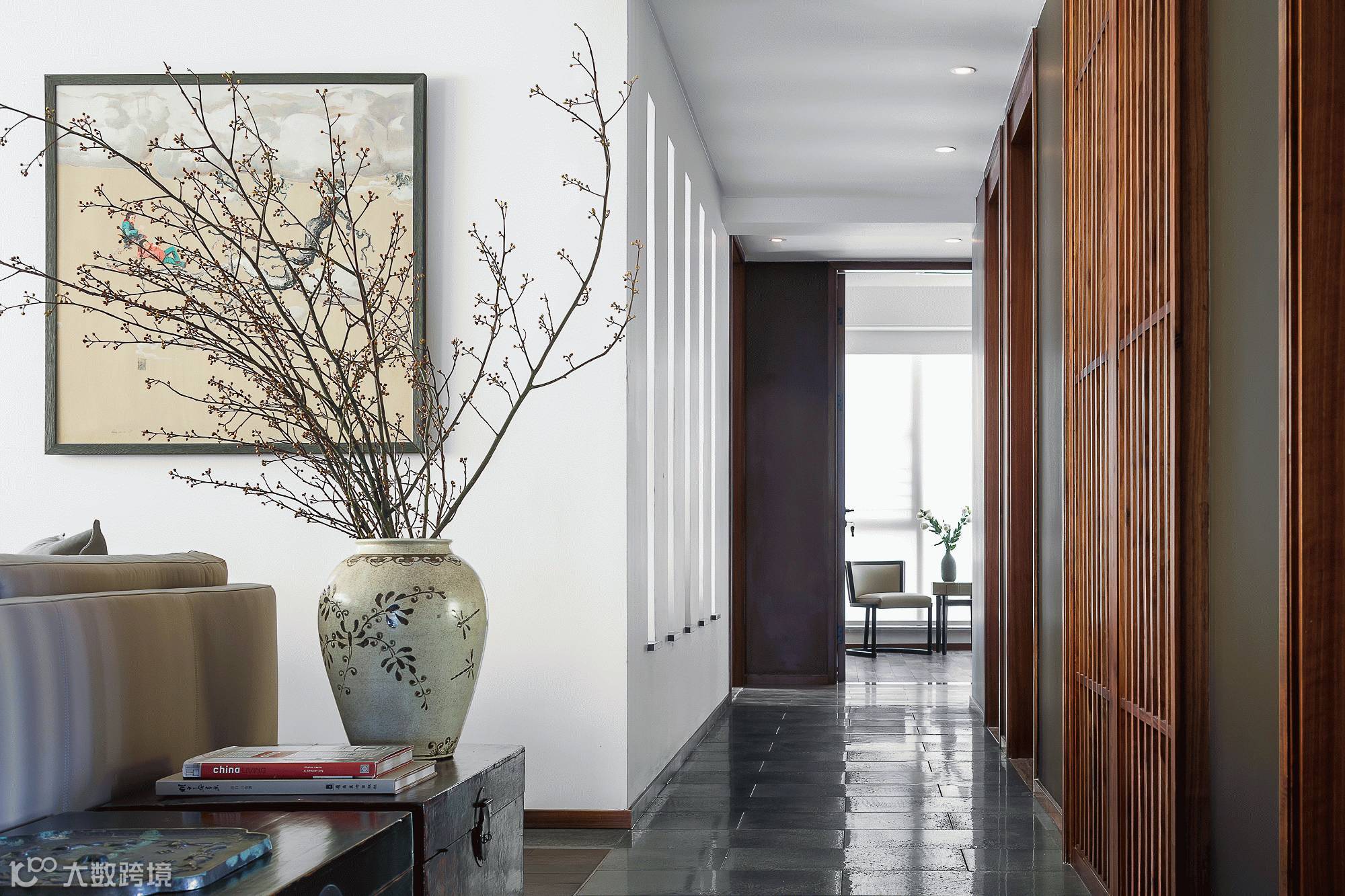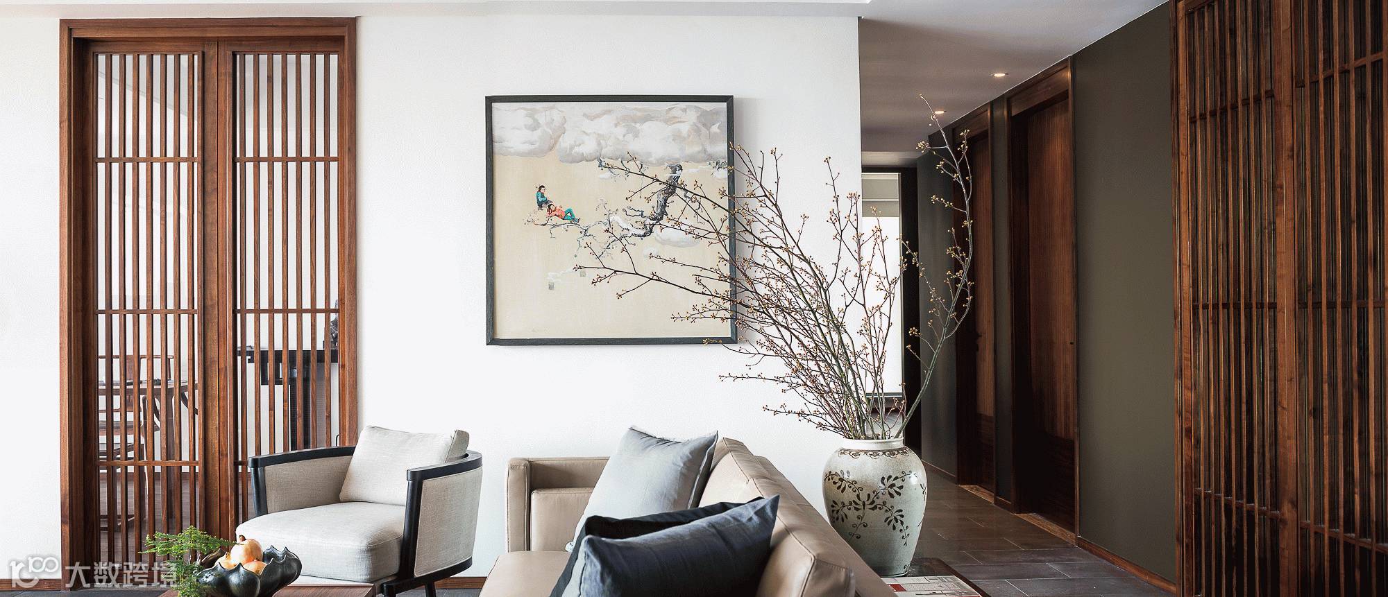 初入玄关,一目了然的中式意境就让人颇为惊喜。步入客厅,干枝的小景,淡淡的禅味,让浮躁的心静下来。当代原创艺术画作清新脱俗,从生活中获取鲜活的艺术感受并从传统美学方法中汲取巧妙的构成元素,完成了一次传统回归。客厅空间以木作生雅致之魂,木案、木地板、木柜,搭配简约的沙发与纯色的抱枕,相映成趣。临窗设有小憩坐台,厅内厅外风景独好,是抚琴冥思的好处所。主人收藏的铁壶、瓷器、佛像更给人带来自然人文古意。