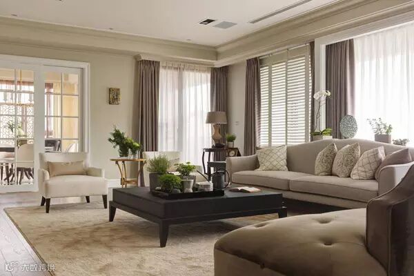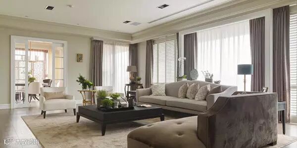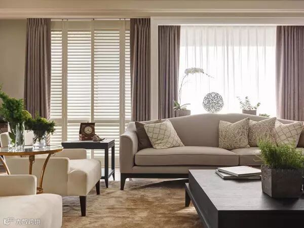 窗景处理:由于建案的窗景面积很大,设计师以「收框」的概念,集中视觉产生段落感。同时考虑如果全数使用百叶窗,感觉太浓重而没有层次,因此同时运用百叶窗与窗帘,让轻重、浓淡都恰到好处。