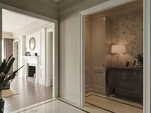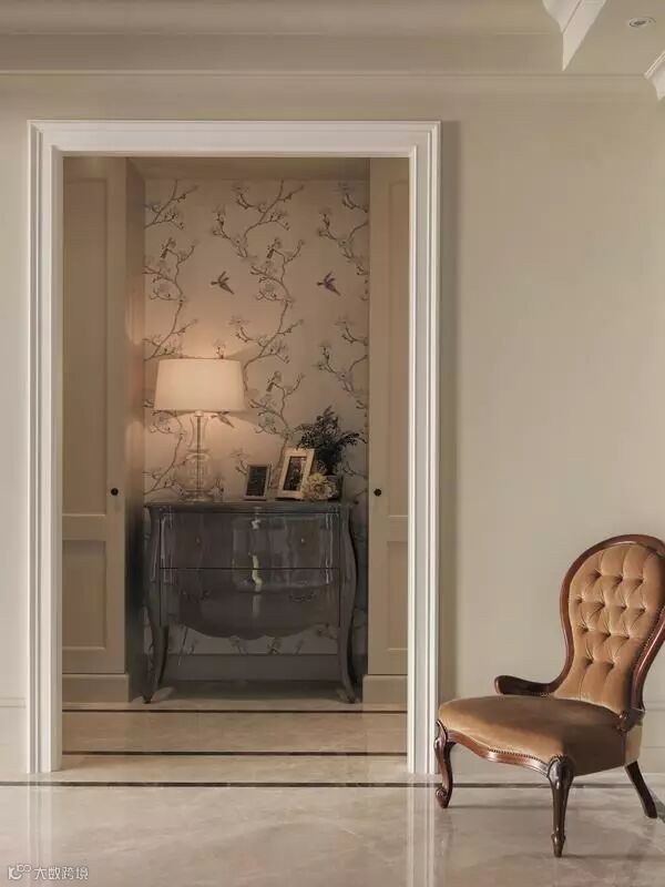 玄关:花鸟刺绣的壁纸为底景,加上浅棕色的柜子与精致桌灯,一进门就有高雅的空间氛围。