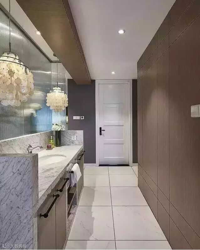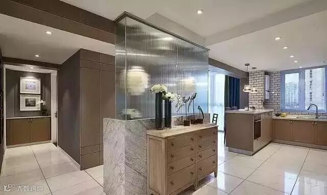 对着大门的位置放了一个浅色系的多斗柜,后方设计了一个顶天立地的隔断装置,下半截是大理石,而上半部分是半透明磨砂玻璃。