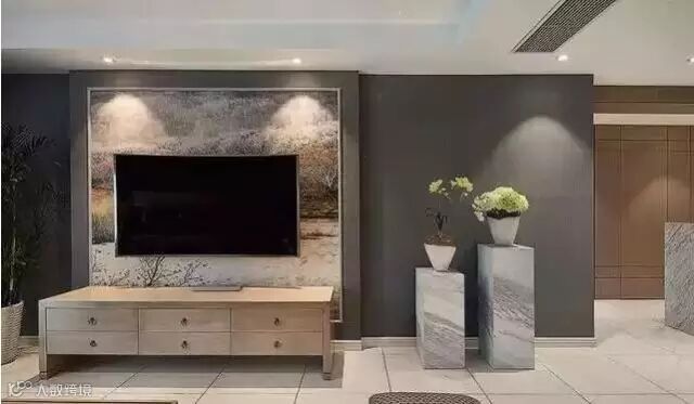 客厅在玄关左侧,灰蓝色的电视背景墙做了立体层次设计。