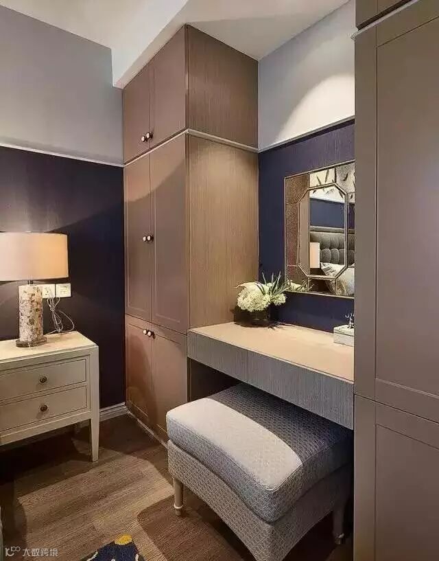 卧室的两个衣柜中间,做了女主人需要的化妆台,偶尔也能当书桌来用。